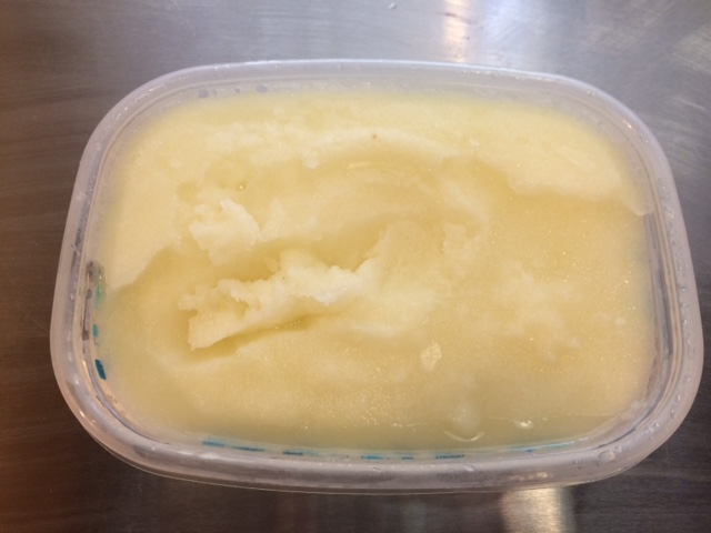 I did find that the sorbet didn’t freeze as quickly as ice cream. I think I had it churning in the maker for 40 minutes, the ice cream is usually done in 25-30 minutes. I think it might be because the ice cream I make is custard, and is rather dense. That allows it to conduct the cold much faster. The sorbet wasn’t much thicker than water when I put it in the ice cream maker. The sorbet came out of the maker about the texture of a slushy. I put it into a container and then into the freezer.