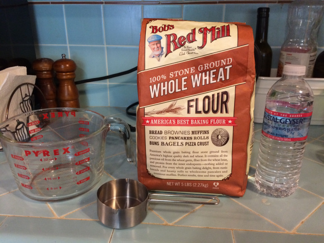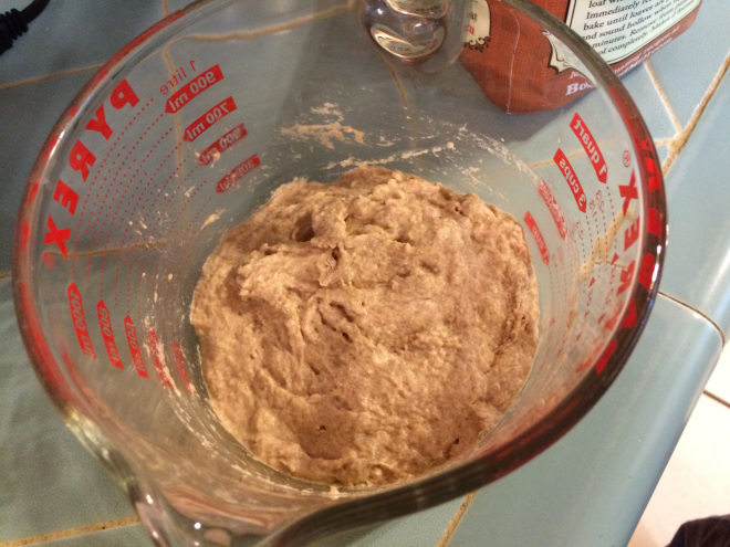 Instead of using my mail-order starter, I decided to try making one from scratch. Thank you to Josh’s granny for the suggestion! Of course, I googled “making sourdough starter from scratch” and up came a post on the King Arthur Flour website. This was even simpler than using the mail-order starter: 1 cup of whole wheat flour mixed with 1/2 cup of cool water. I did have to add about a 1/4 cup more water though because I could have picked up the mixture with my hand using just the 1/2 cup of water, and the mixture is supposed to be “goopy,” not a dough ball that you can pick up. Hopefully, this addition doesn’t mess with the starter. At least, all I lose out on if I kill this starter is a cup of flour and some water.