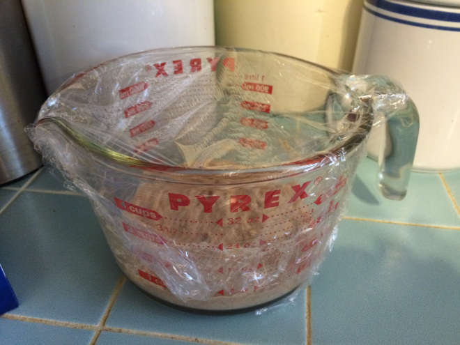 I used a wide-mouth container this time rather than a mason jar. It was easier for stirring. I also have the container sitting in an area of the kitchen that is used less often than over by the olive oil. Hopefully, the starter will like it better over there!
