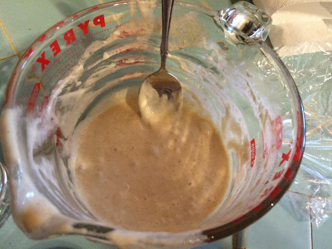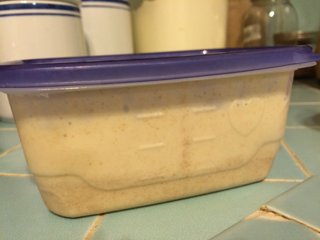 This morning, I fed it again at around 9:30 AM. It didn’t look as bubbly as it did last night when I fed it. I think that was my fault though. I used cold spring water instead of room temperature or cool spring water. By the way, it was 105 degrees or something ridiculous like that yesterday. Maybe that had something to do with it not being as bubbly. Hopefully, it will revive some today. It is only supposed to get up to the 80s and it might rain.