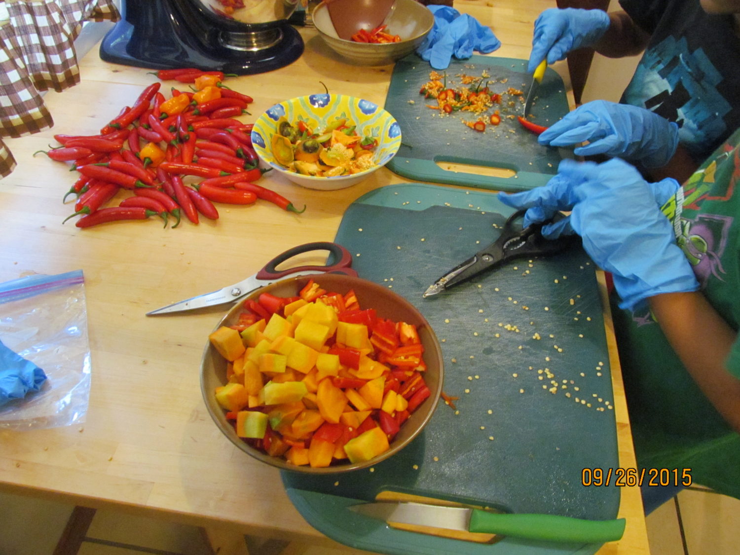 I started out cutting the peppers with my two oldest sons. I was starting to come down with a stomach bug and being around the peppers made me feel really sick. Thankfully, my boys are good workers and they cut up and removed the seeds of most of the two pounds of peppers for me