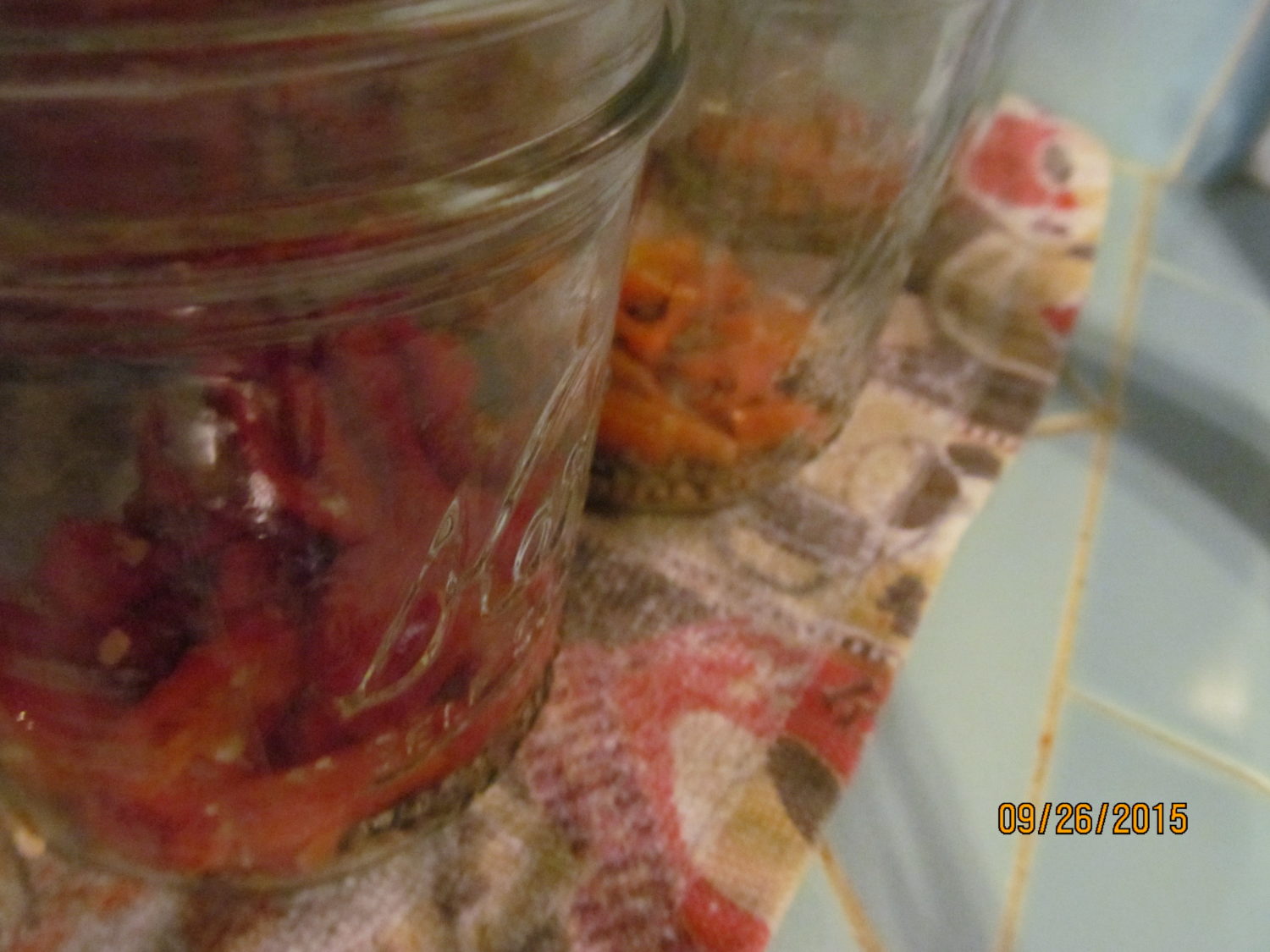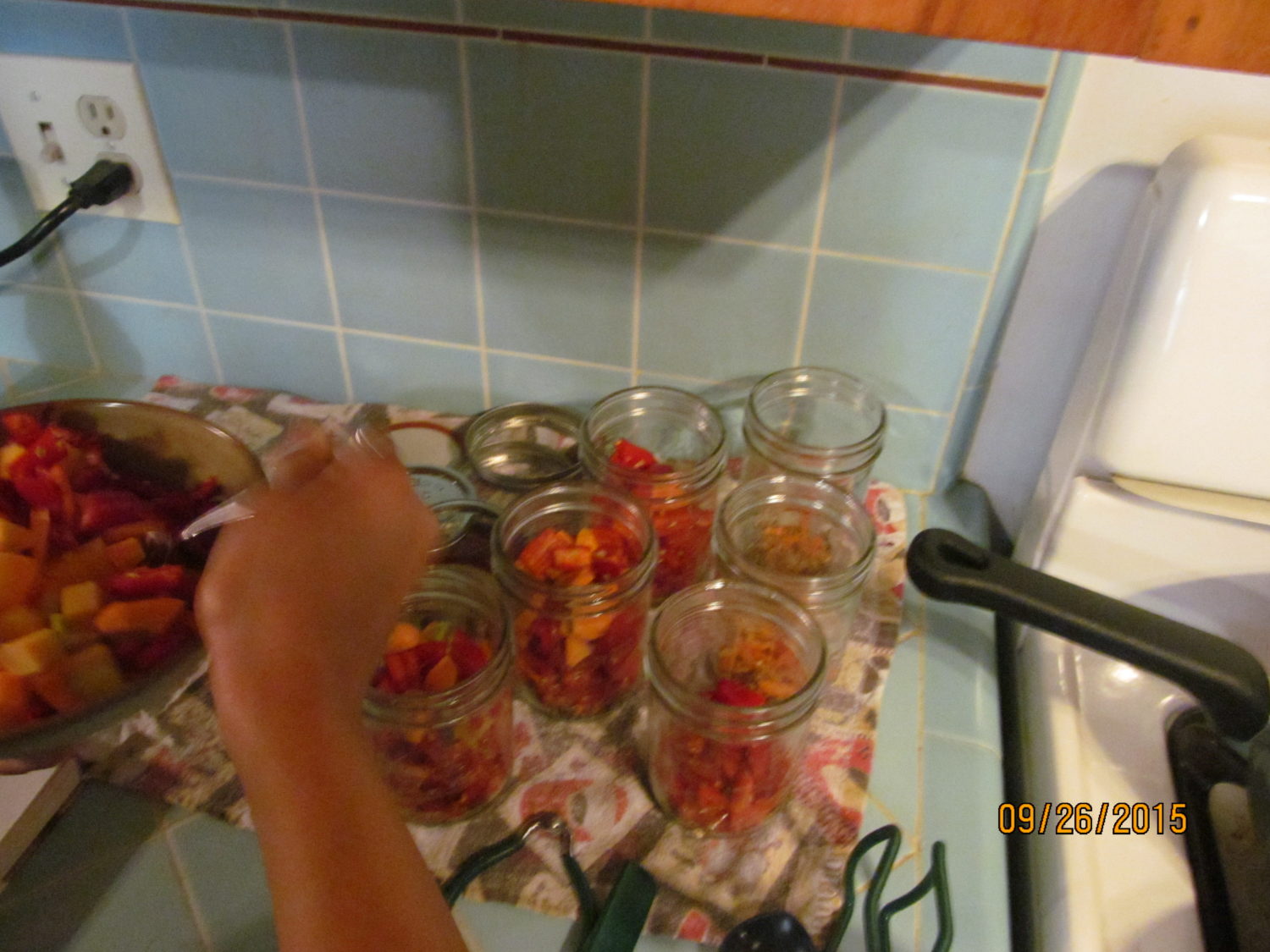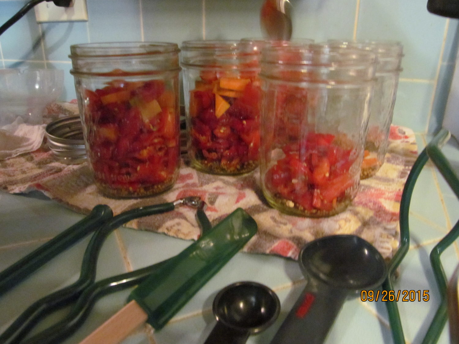 We filled the jars with peppers and carrots. Only 3 of the 6 jars had Habaneros added.