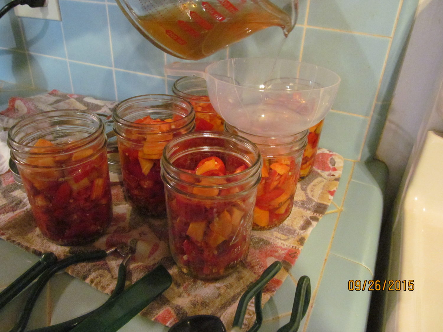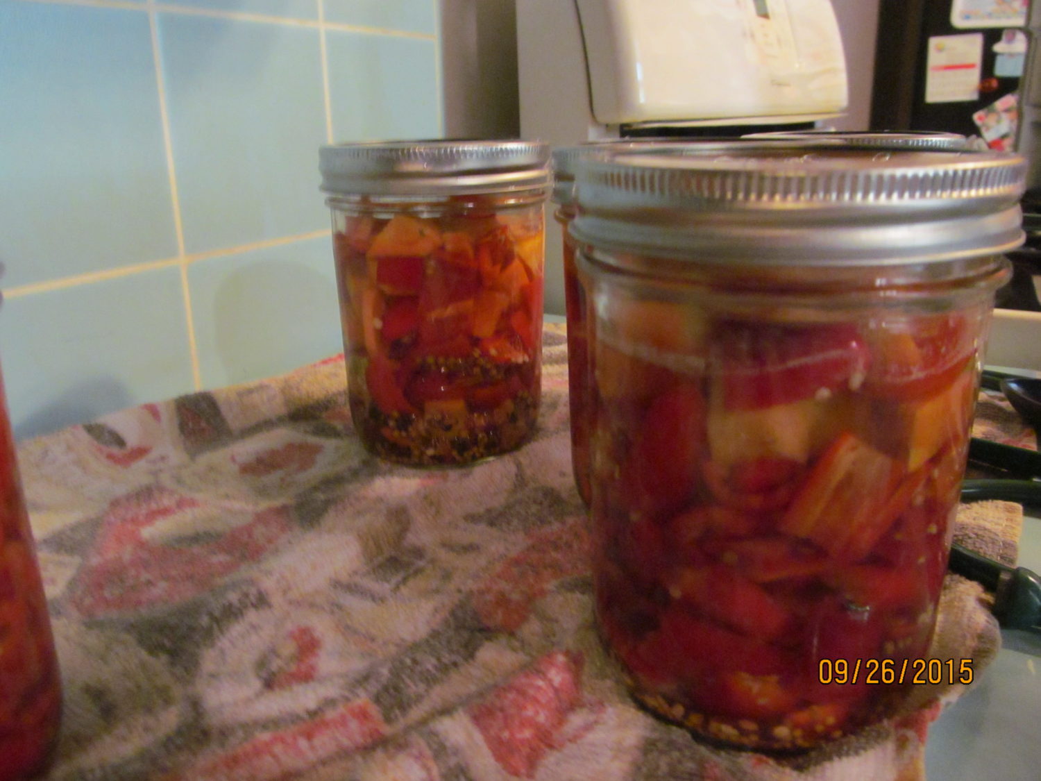 We used this recipe for Sweet Honeyed Pickle Peppers that I found. The recipe called for 8 ounce jars, but we had 16 ounce jars so we decided to double the recipe. I think we had about half a pound of Santa Fe Grande peppers left, and we added in about 4 Habaneros. We didn’t have an alum, and Lynn forgot to add the olive oil at the end.