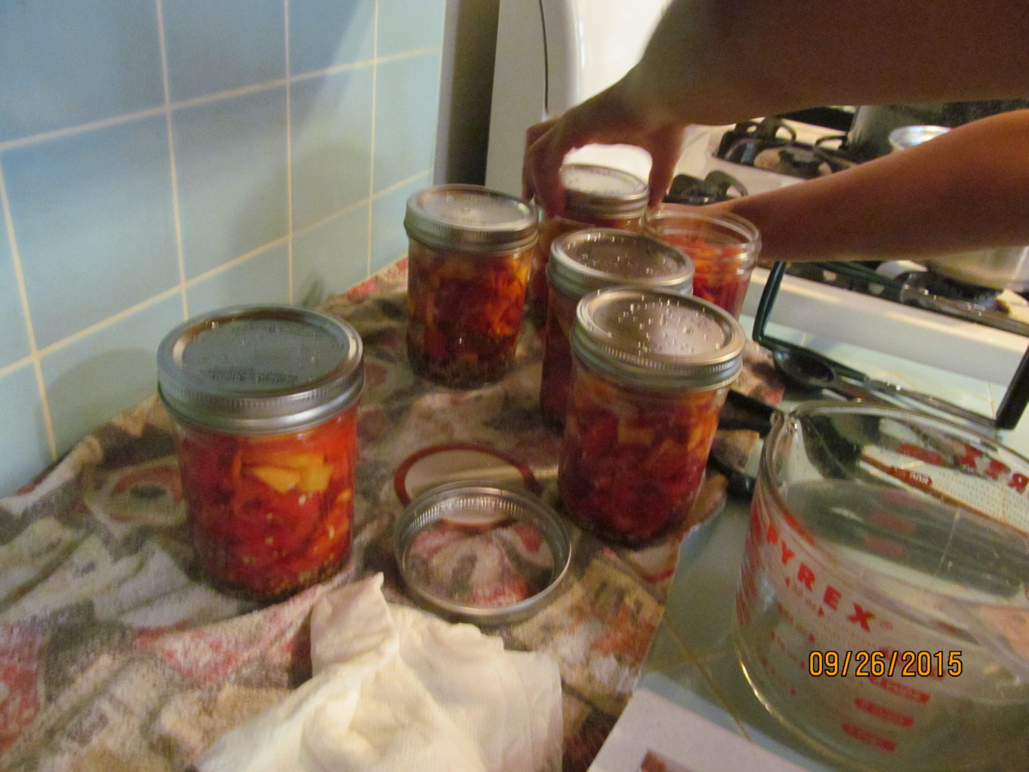 As an aside, it is important to have enough gloves when cutting the peppers. I had some gloves and I let my sons use most of them. I didn’t have one on my left hand while holding the peppers and cutting them. Later in the evening I was stuck on the couch feeling horrible as the stomach bug got worse. At one point my eye started to water and I wiped it with my hand. Some of the pepper juice must have still been on my hand and I got it into my eyes. I felt like I had been pepper sprayed, and that is never a pleasant experience.