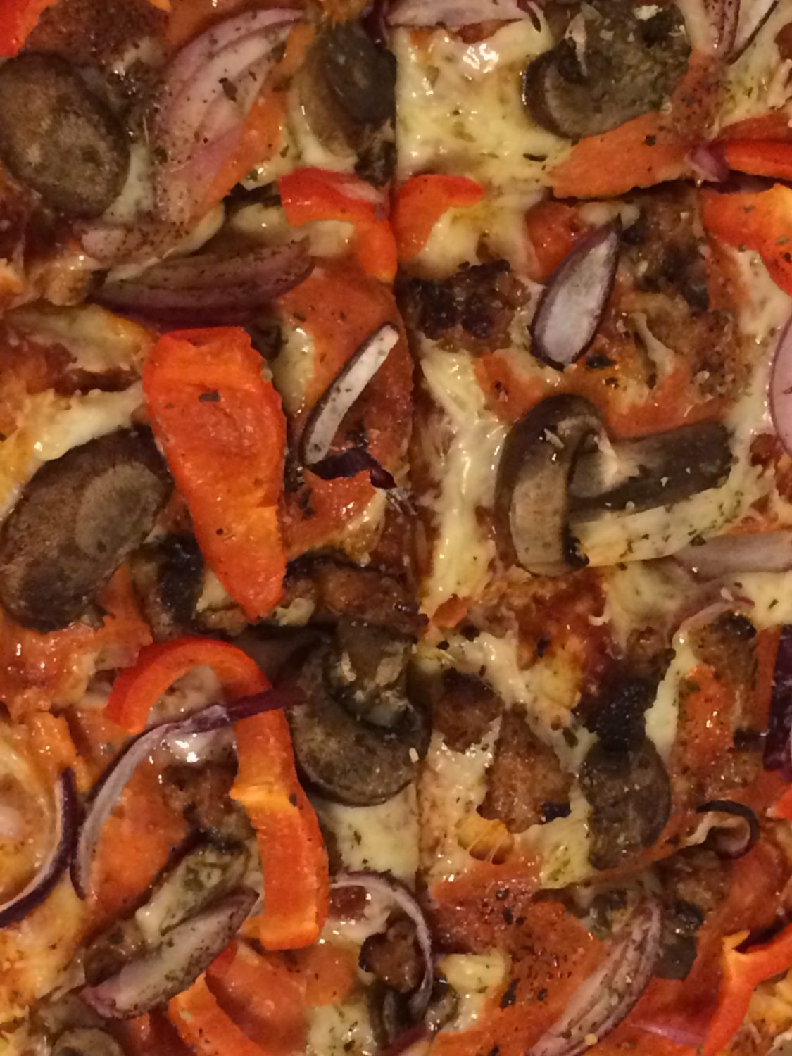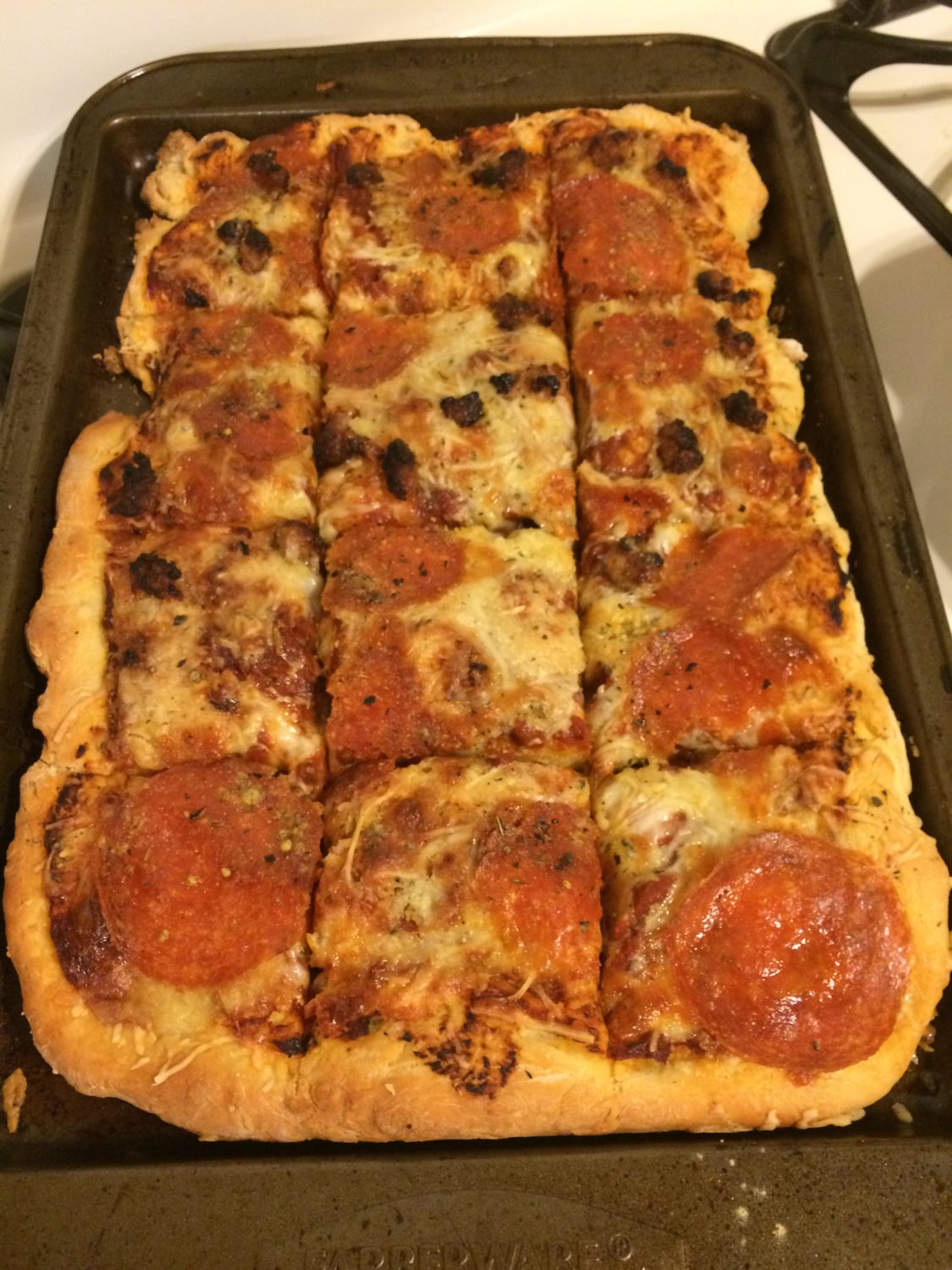 On Saturday, we had homemade pizza. I doubled the recipe and still didn’t feel like it was enough crust. I think I might have messed up on my timing with this though. The dough needed to rest and rise longer in the pan. I did use my sourdough starter as most of the raising agent so that probably contributed to the longer rising time. The pizza was good though and had a great crust because yesterday we ate up the rest of it (and I guess it was enough crust!)