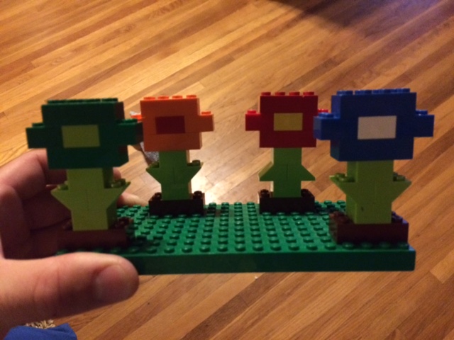 Our 6 year old made a Mario Bros themed plant.  I think it is one of the mushrooms that you jump on on some of the levels.  It has Kai from Ninjago jumping on it.