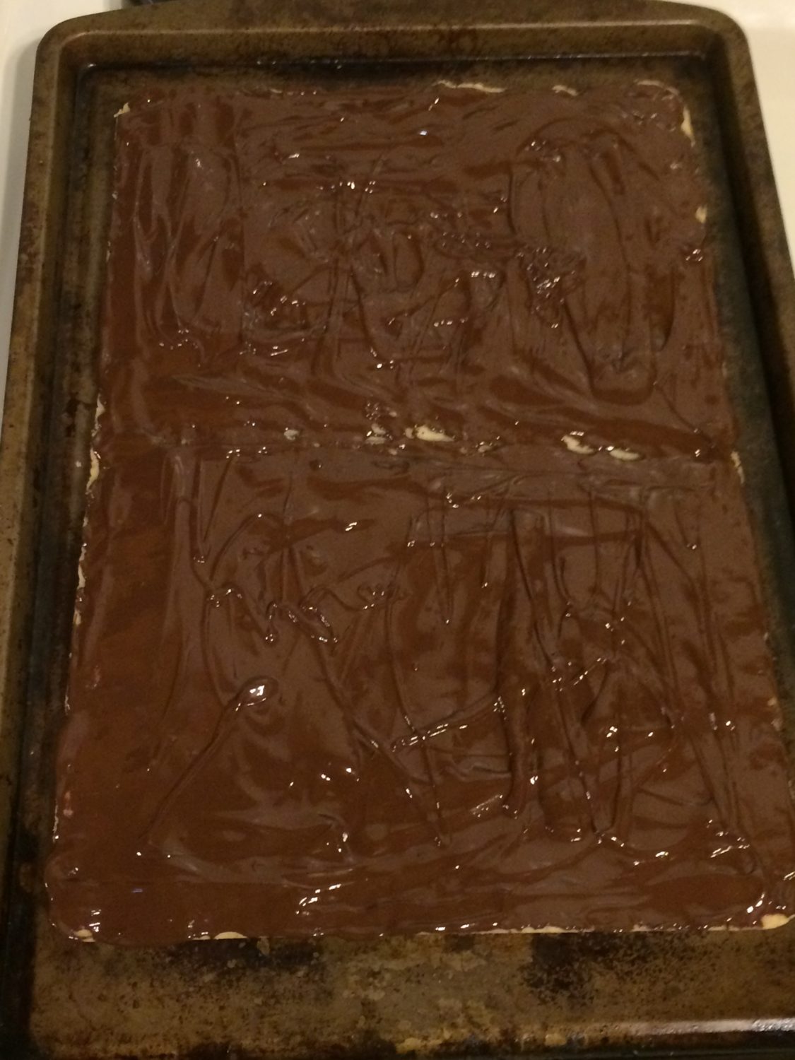 After I sprinkled on the bacon, Josh put the pan in the fridge so that the chocolate could cool.