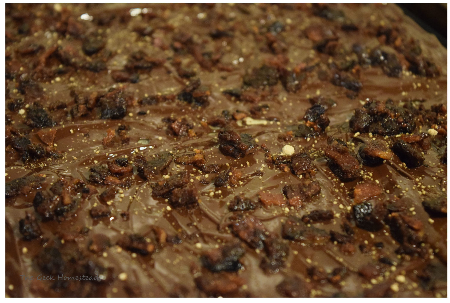 Before the chocolate cooled, I sprinkled on some candied bacon that Josh had made earlier.  Most of the recipes he found for candied bacon used uncooked bacon, so he had to tweak one of them a bit to use the cooked bacon we had left over.
