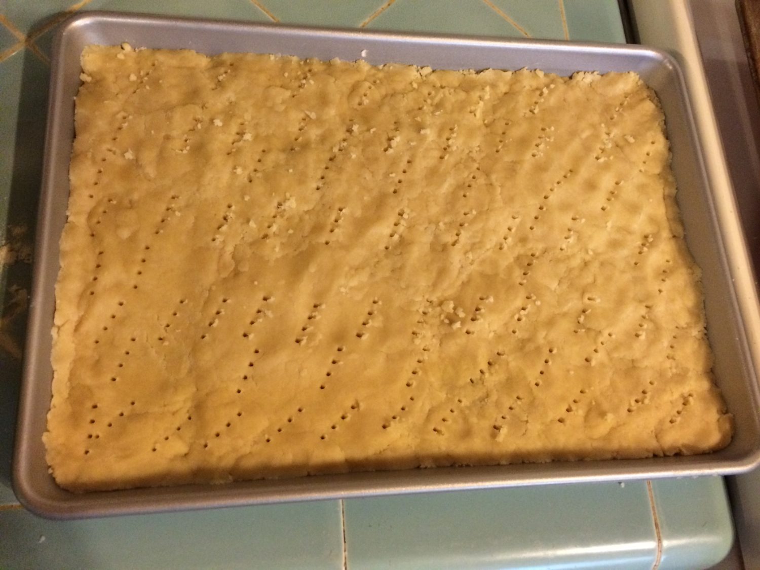 I kept an eagle-eye on these while they were baking. I didn’t want them to brown too much. They ended up being the perfect color after 25 minutes. I cut the sheet of shortbread in half so it would be easier to get out of the jelly roll pan.