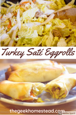 Turkey and sate probably don’t seem like they should go together, and at first, when I made these turkey sate eggrolls, I wasn’t sure how they would taste. I’m also not a big fan of cabbage! I was pleasantly surprised that I actually liked these.