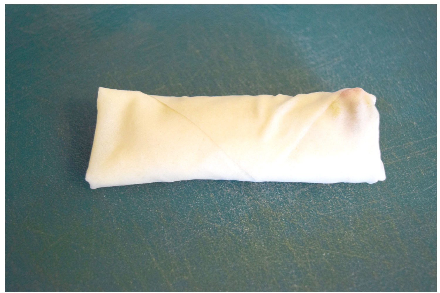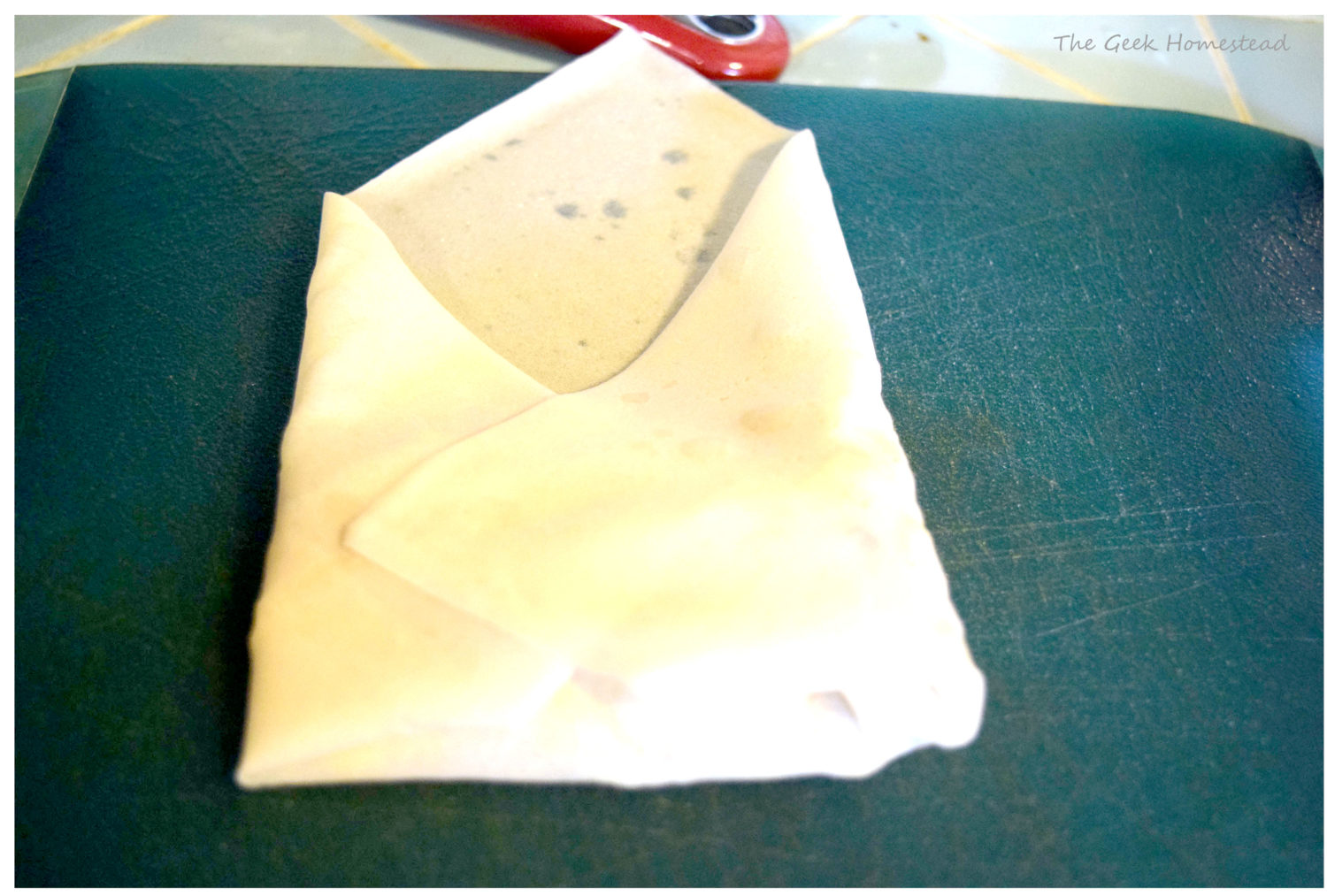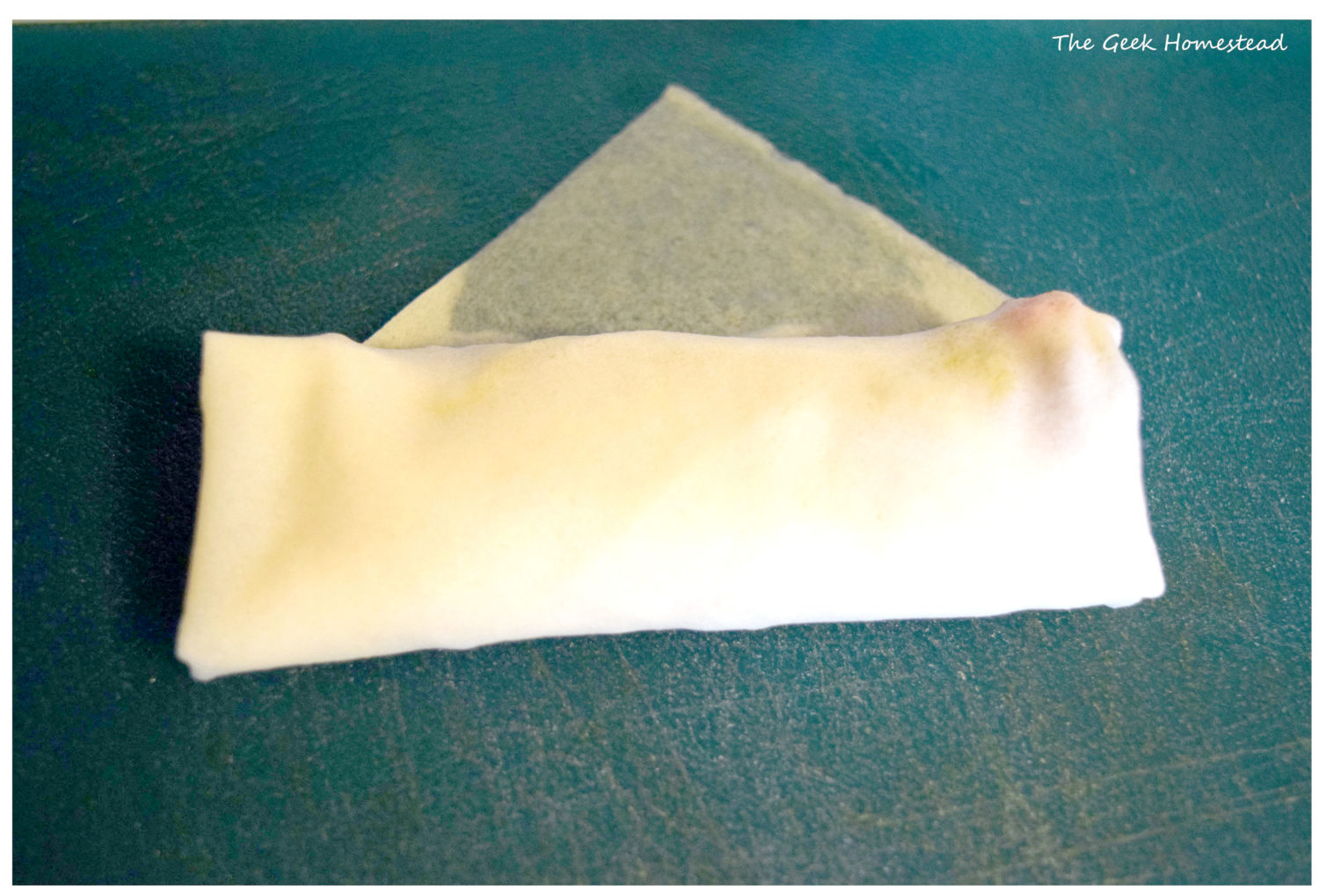 Moisten the top corner with water and roll it up, tucking the filling in firmly as you go but not so tightly that you break the wrapper.