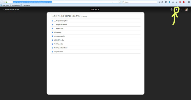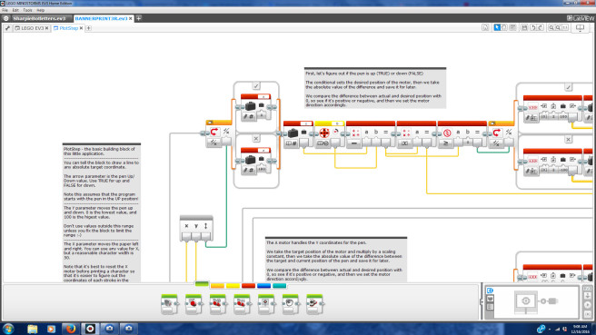 There isn’t as much info as you would expect about this bot on the Internet. The best place we found for the program itself was at ConstructingKids.com.  Ralph Hempel designed the original Banner Print3r bot and building instructions are also at the Lego.com website (the downloadable program doesn’t seem to be at the Lego website though). We used the building instructions from the Lego website and then downloaded the program from ConstructingKids.com. You will need to download two of the files from the Google Drive that is linked at Constructing Kids: LEGO EV3.ev3p and PlotStep.ev3p. The Lego EV3 file will tell your bot to print out “LEGO EV3.” This is a good file to use just to see if your Print3r bot is working correctly. The PlotStep file is what is used to “build” letters.