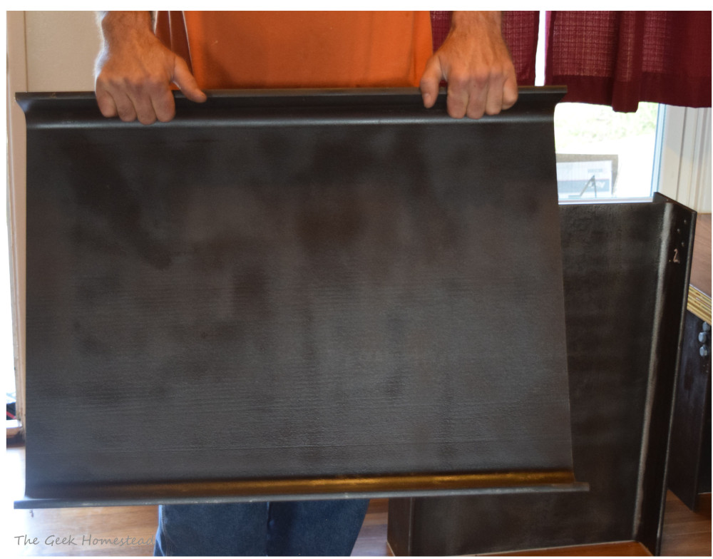 Using my grinder, I removed most of that rust.  The metal underneath didn’t look new, but had a sort of aged patina look which is what I wanted.  To darken up the metal I cleaned it all with mineral spirits.  Then I sprayed with with a clear semi gloss enamel for protection.\