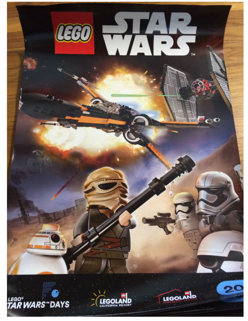 After taking a quick ride through the Lego Ninjago ride, we went to the Model Shop Rooftop, which is also very close to Miniland. Usually, when we go to Lego Star Wars Days, we don’t really ride many of the rides. We are off having too much fun being Star Wars fans! The Model Shop Rooftop is where you can pick up some free goodies: this year’s giveaways were a poster, two pop badges, and a pin.