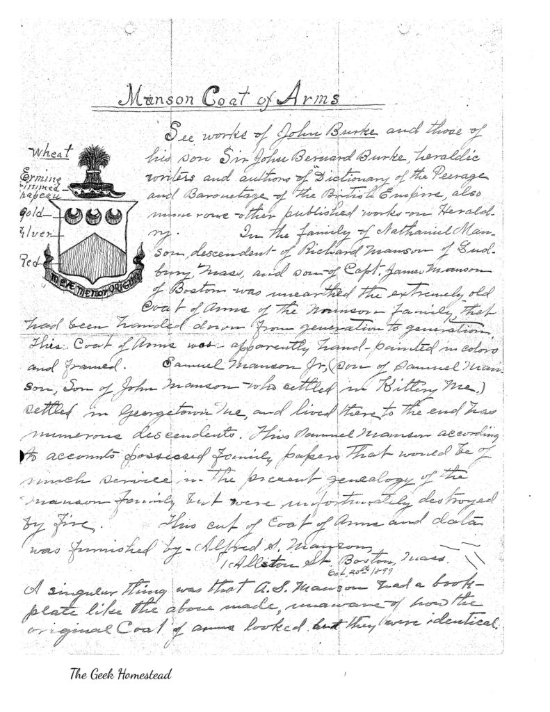 This coat of arms was apparently hand-painted in colors and framed. Samuel Manson Jr. ( son of Samuel Manson, son of John Manson who settled in Kittery, Me) settled in Georgetown, Me, and lived to the end had numerous descendants. This Samuel Manson according to accounts possessed family papers that would be of much service in the present genealogy of the Manson Family but were unfortunately destroyed by fire.
