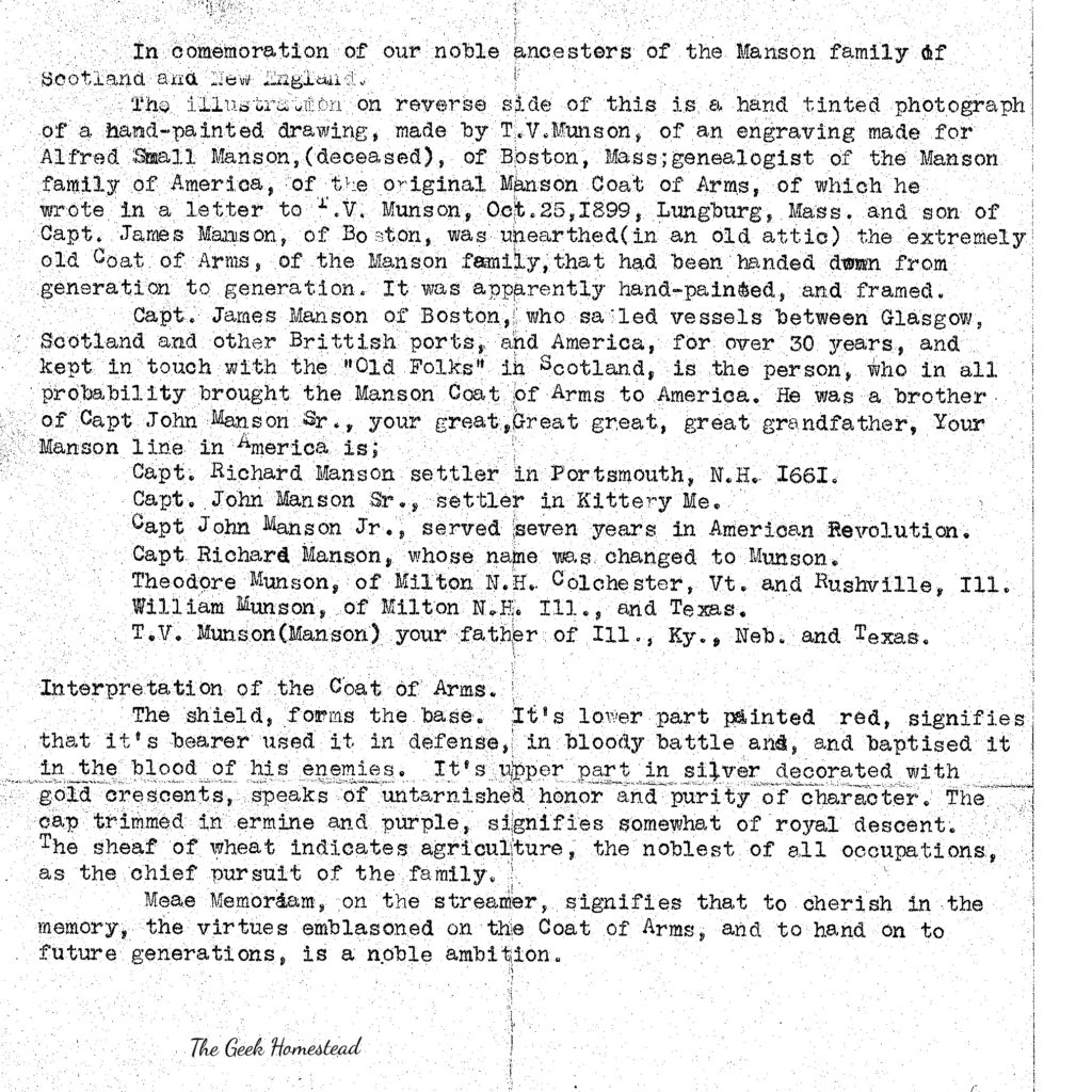 In the family of Nathaniel Munson, descendant of Richard Munson of Sudbury, Mass, and son of Capt. James Manson of Boston who unearthed the extremely old coat of arms of the Manson family, that had been handed down from generation to generation.