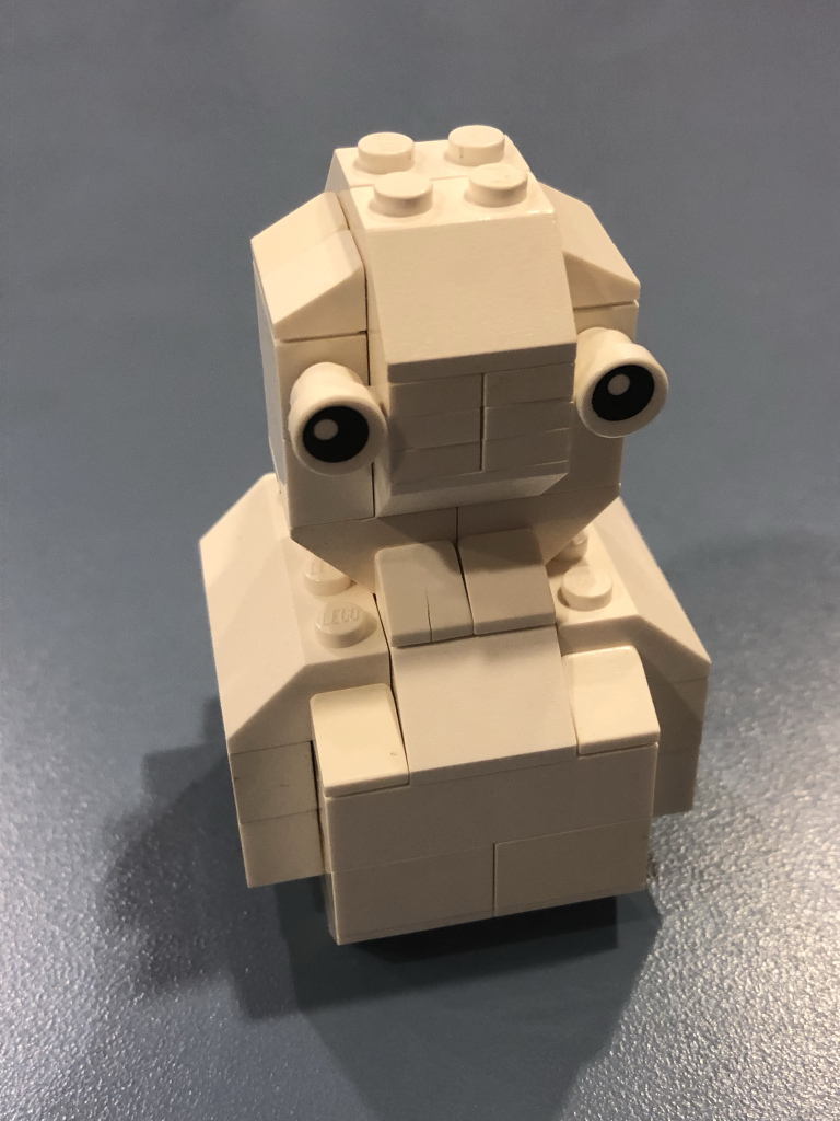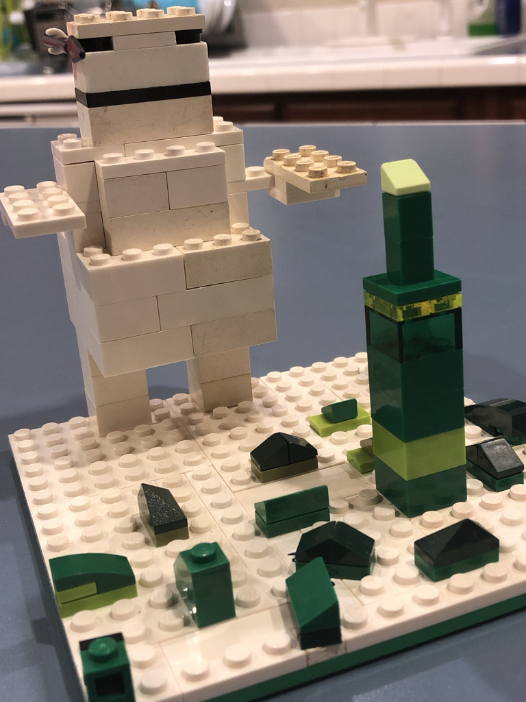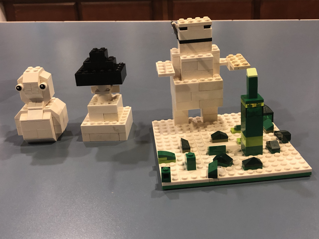 Ian’s snowman build is very much Ian. He built a microscale city (with green buildings because they painted them that way) with a giant snowman attacking it. Is anyone else getting flashbacks to the Stay-Puft Marshmallow Man from Ghostbusters? This snowman is not quite so jolly-looking though!