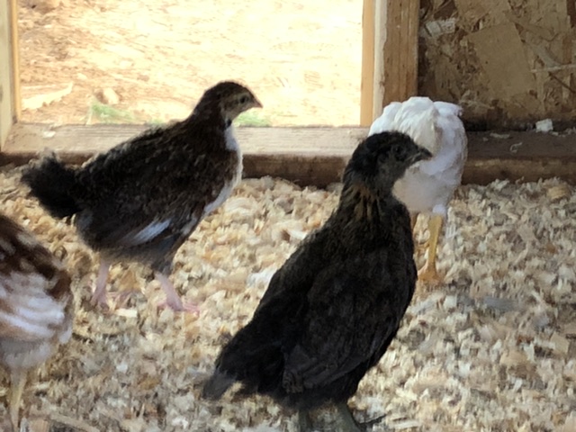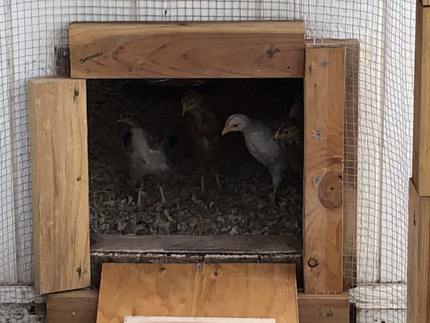 The three smaller chicks will probably go into the coop in a chick box at the end of this week. We are supposed to have some cold days, so we will keep them in the house a bit longer.