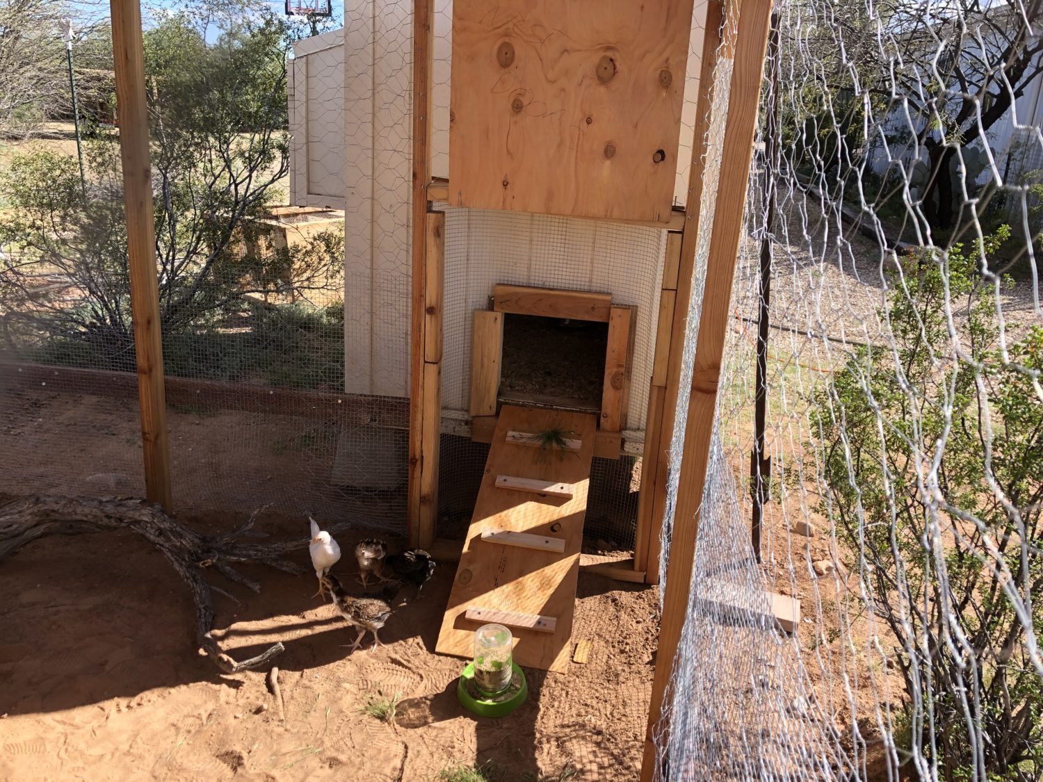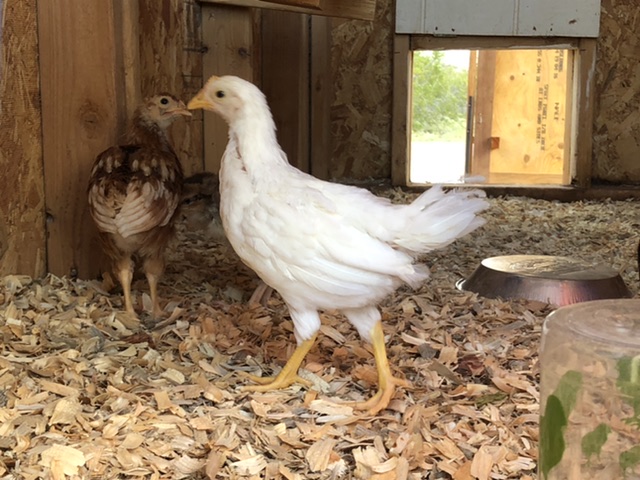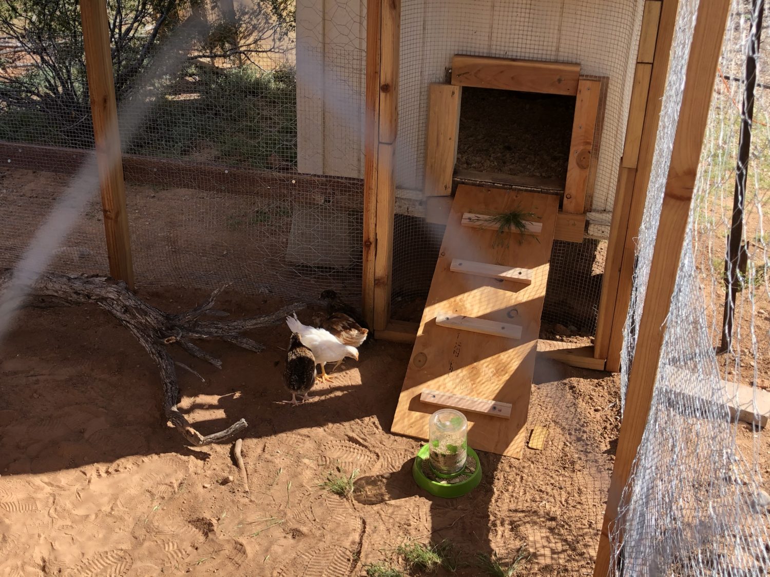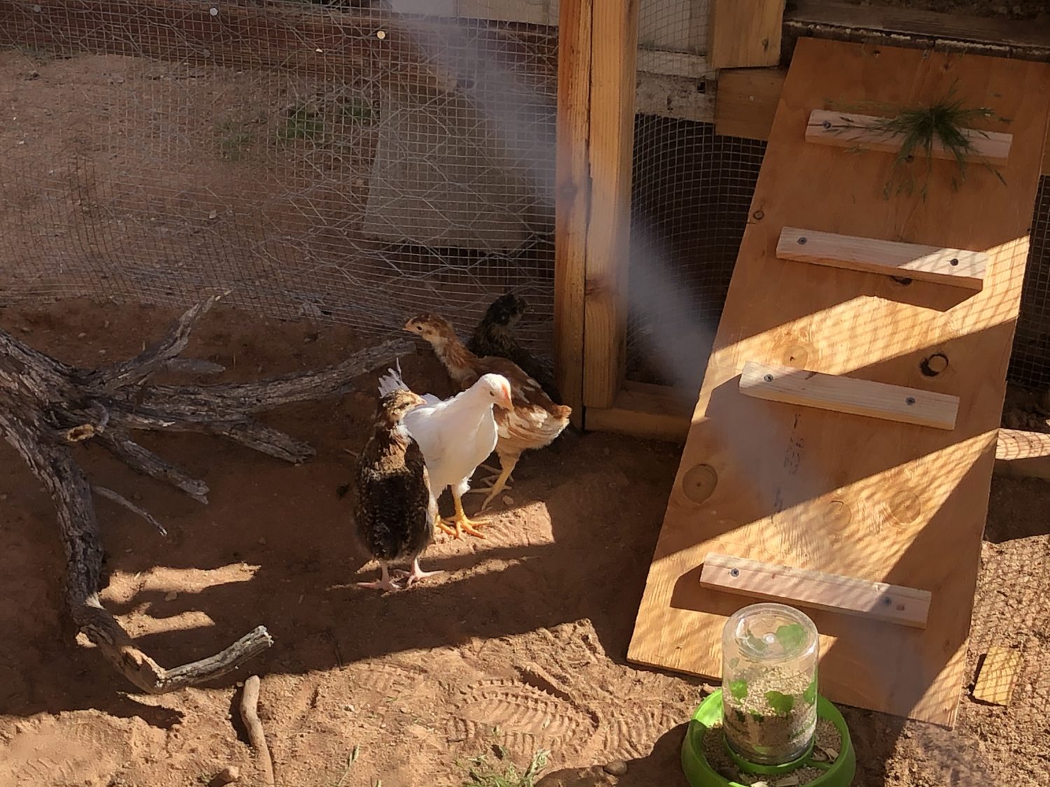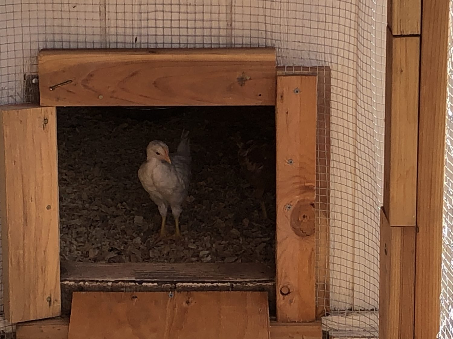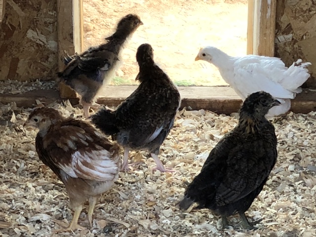 Our chickens are still doing pretty good. The original chicks we bought are getting big and were not happy in their boxes in the house anymore. We put them in the coop with no access to the run at first. Yesterday we opened up the run, but they are all very uncertain about being outside on the dirt. 4 of the 6 went into the run, but only for a little while.