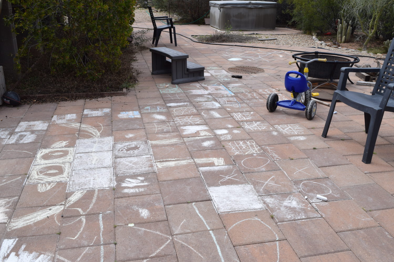 We also have continued to homeschool here on the homestead and decided to take no days off until everything opens back up again. Because of the great weather we’ve had the past week, after school and during recess, the kids have been outside playing. As you can see, our back patio is nearly covered with chalk drawings!