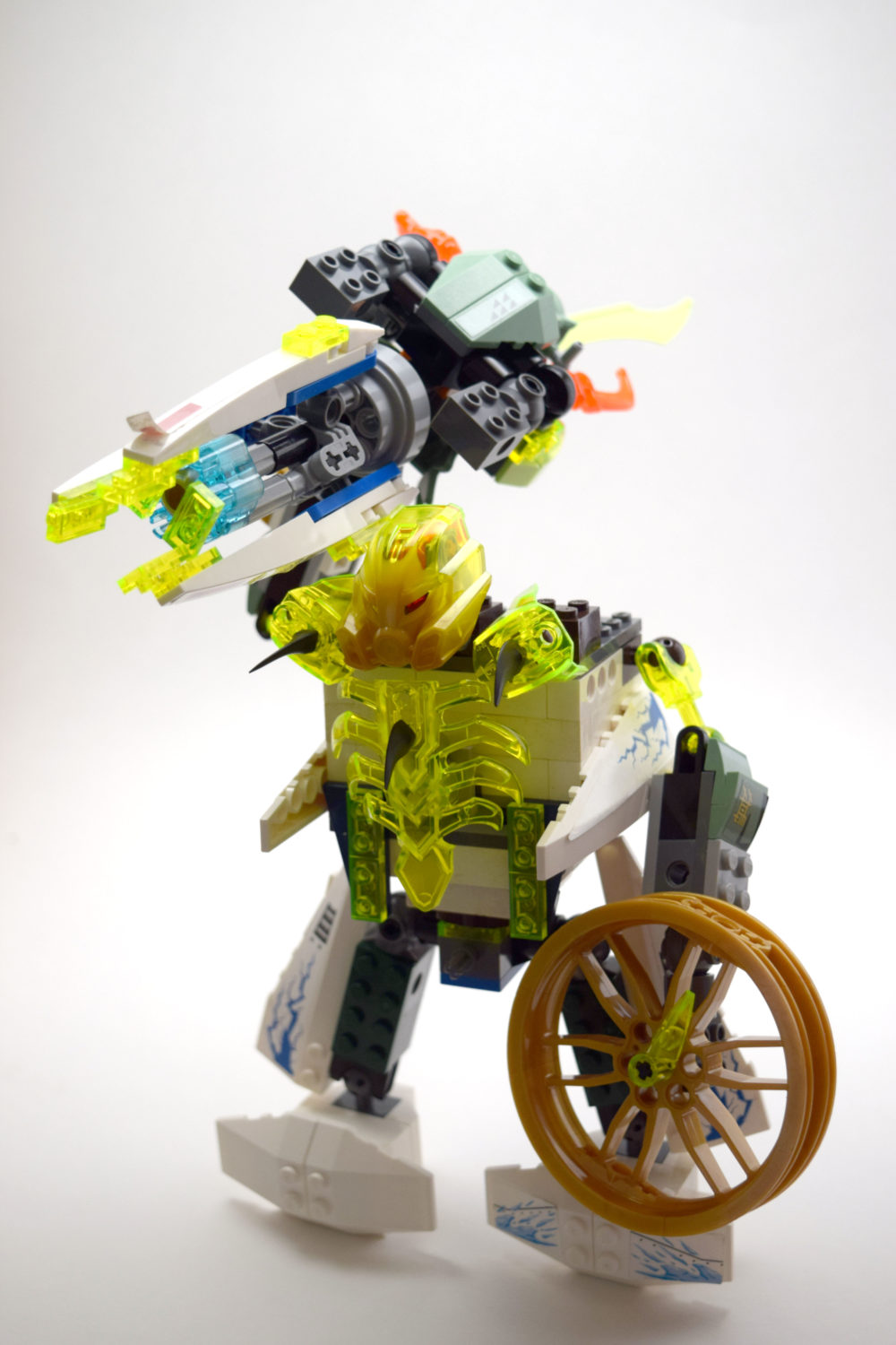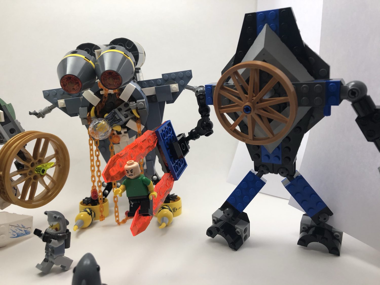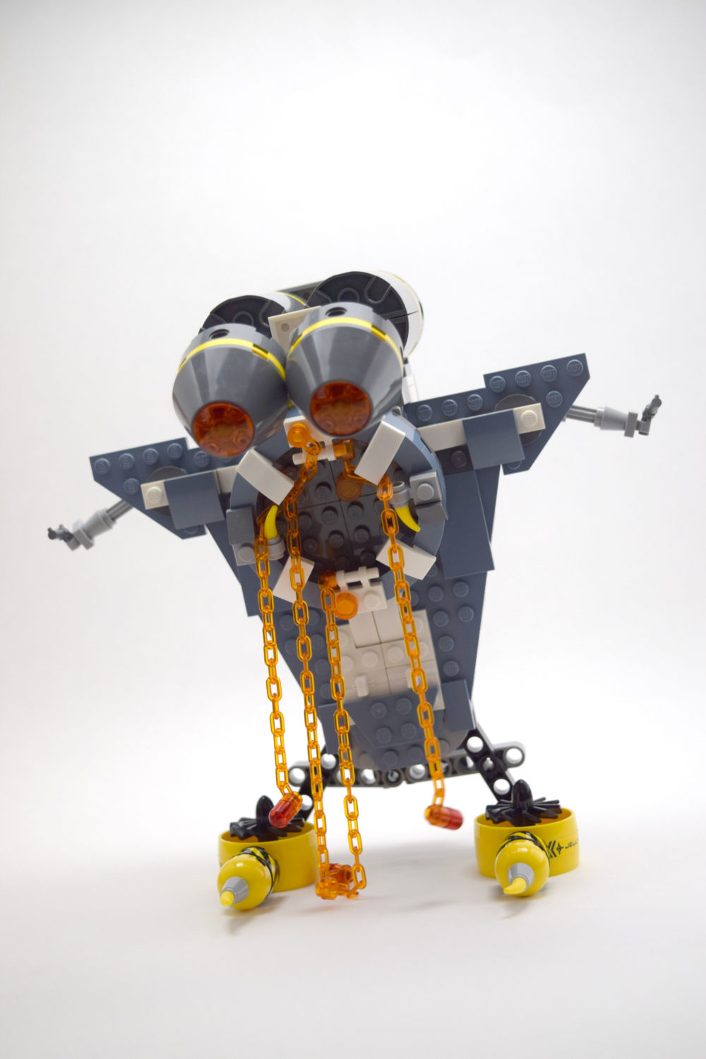 Matthias built a monster using pieces from his Manta Ray Bomber set and the LEGO Ninjago Flying Jelly Sub set. The orange chains are drool dripping from the monster’s fangs. Matthias says he was trying to make a jawless fish monster. I think he succeeded. It has very tiny pistols in its hands. We will call it The Dreel.