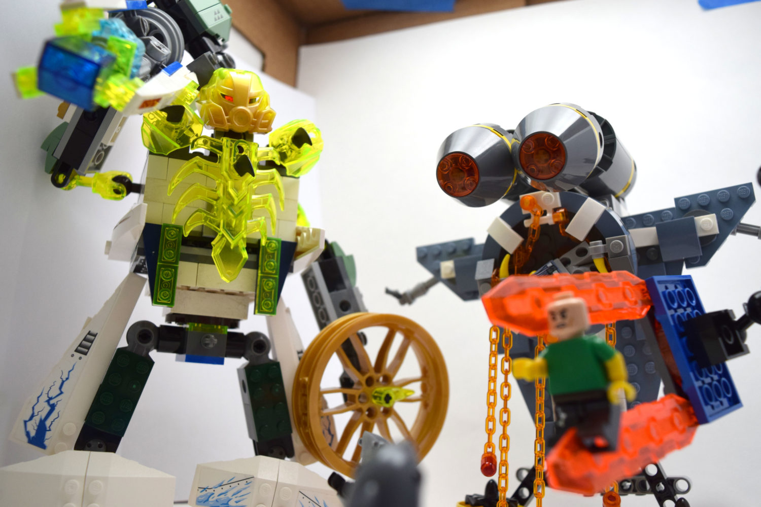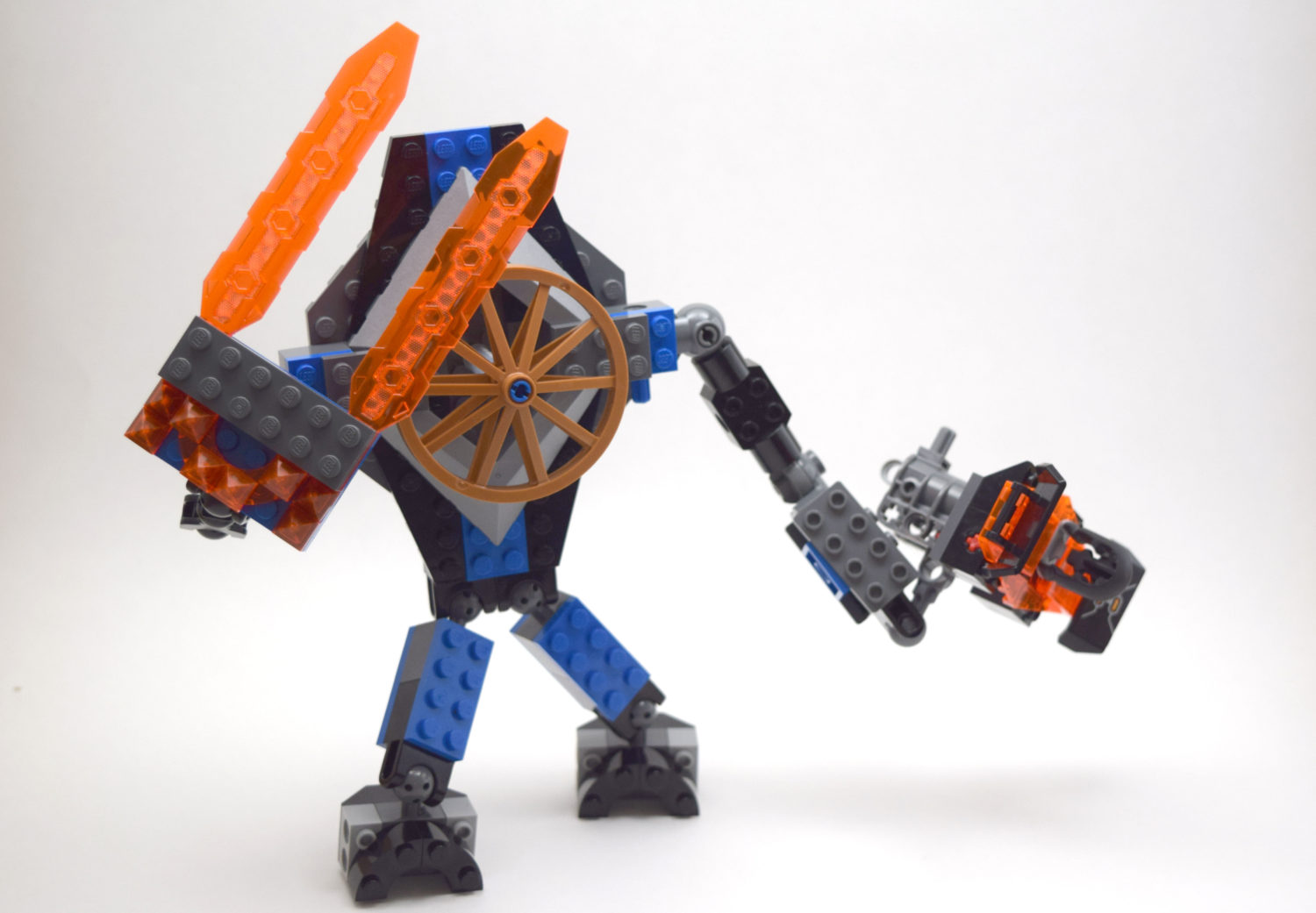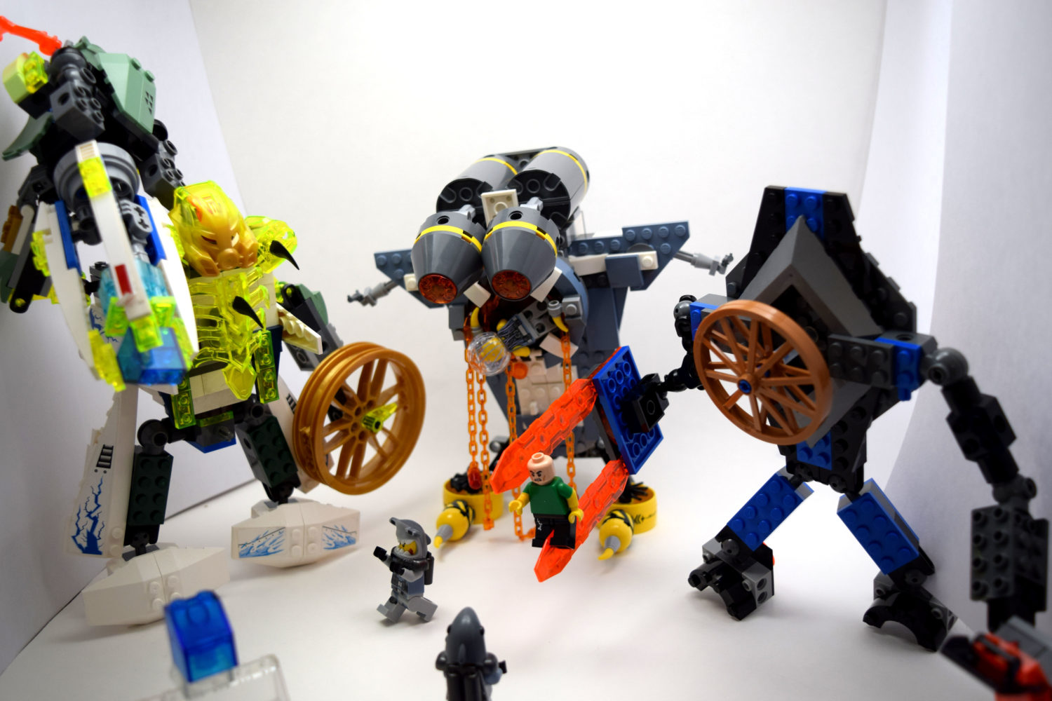 Matthias built a monster using pieces from his Manta Ray Bomber set and the LEGO Ninjago Flying Jelly Sub set. The orange chains are drool dripping from the monster’s fangs. Matthias says he was trying to make a jawless fish monster. I think he succeeded. It has very tiny pistols in its hands. We will call it The Dreel.