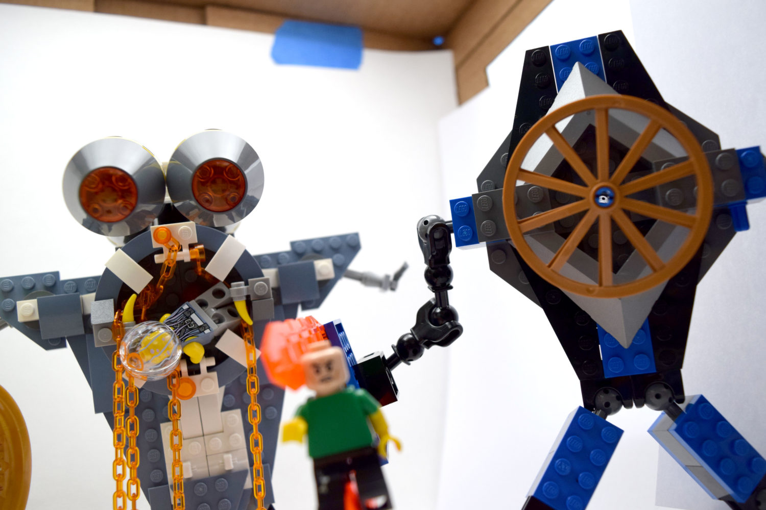 Rhys built a diamond-shaped monster with a large wheel for its eye, a sword/shield combo in one hand, and a gun in the other. Most of these pieces are from his Black Knight LEGO set (NEXO Knights). The large wheel is from LEGO Ninjago Movie Piranha Attack. The large wheel is attached to the monster with a plastic tube from a glowstick pack since he couldn’t find an axle and it spins using a star-shaped piece on the back. We will call it The Cyclops Knight.