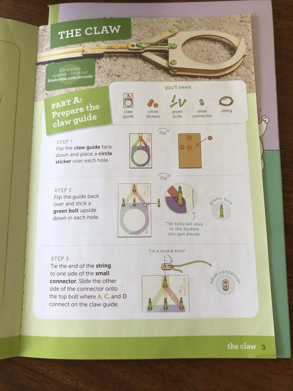 The Arcade box contains the pieces to assemble a claw, two pom-pom creatures, and two fun books: one assembly instruction manual and one activity magazine. The assembly instructions are clear and easy to follow, though for this age group, they will still need help with some of the more difficult assembly.