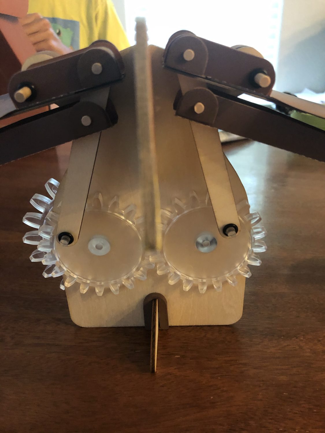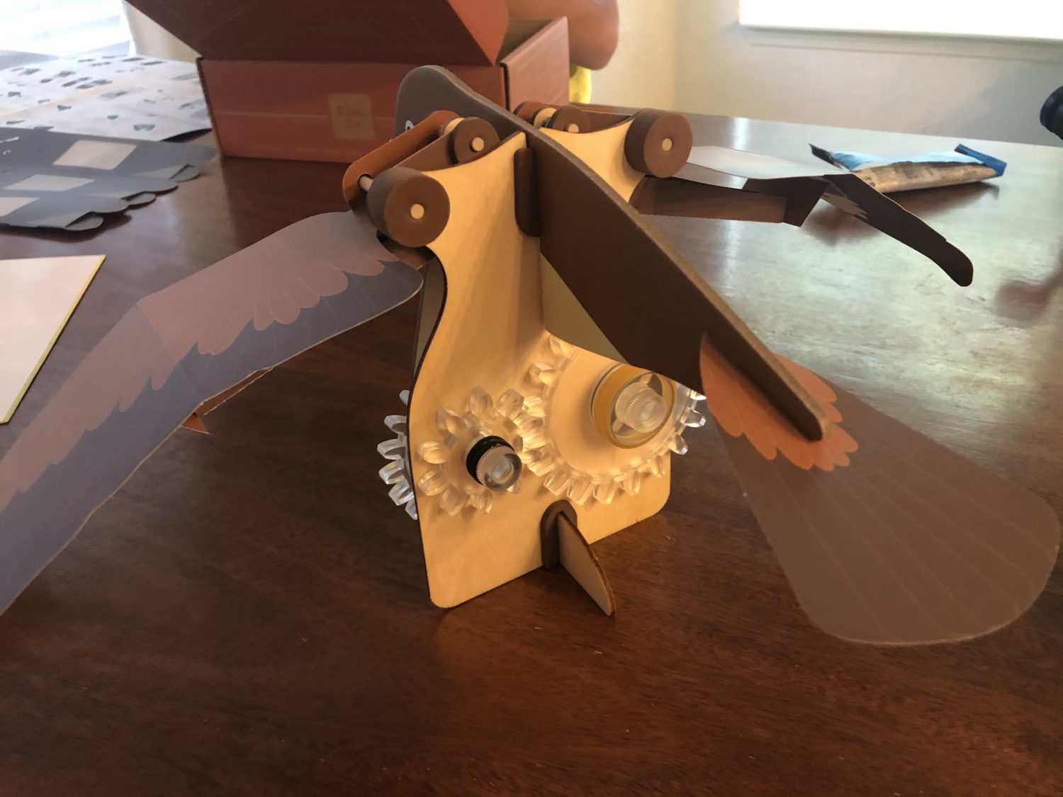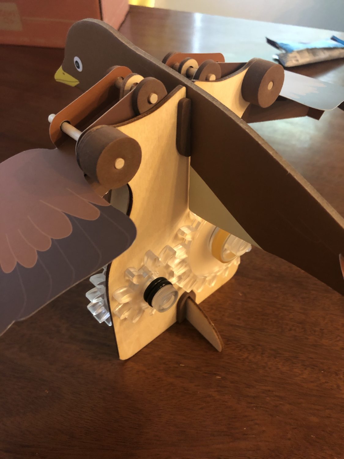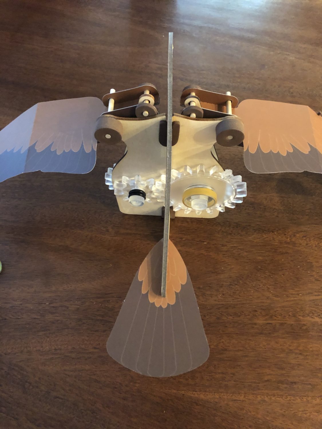 You turn the largest gear on the back of the bird to make the bird flap its wings.