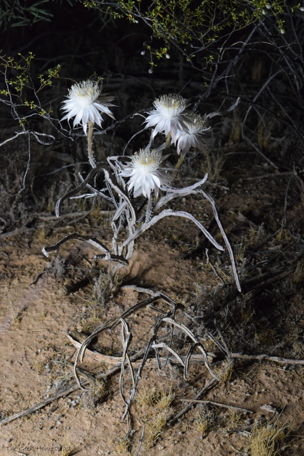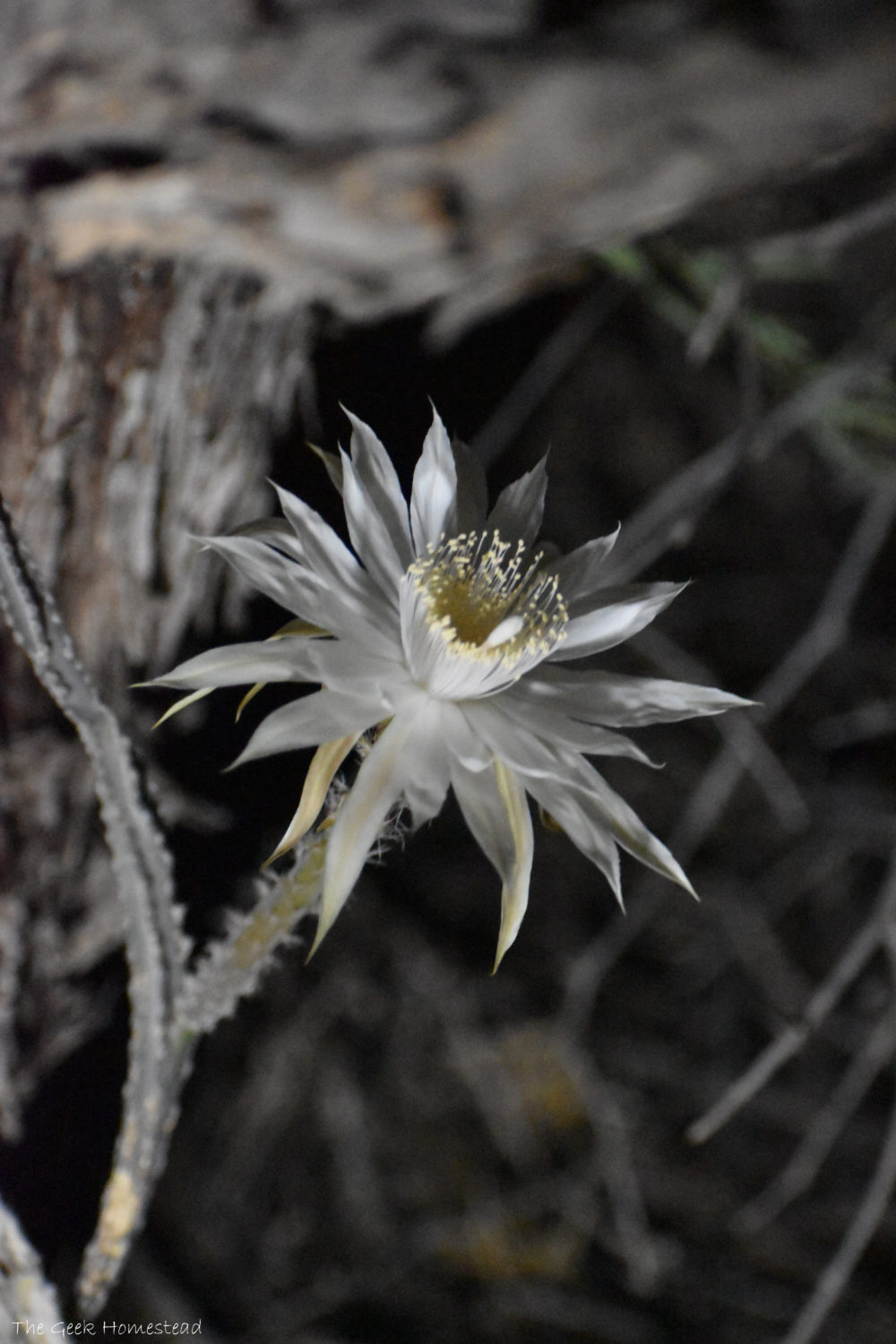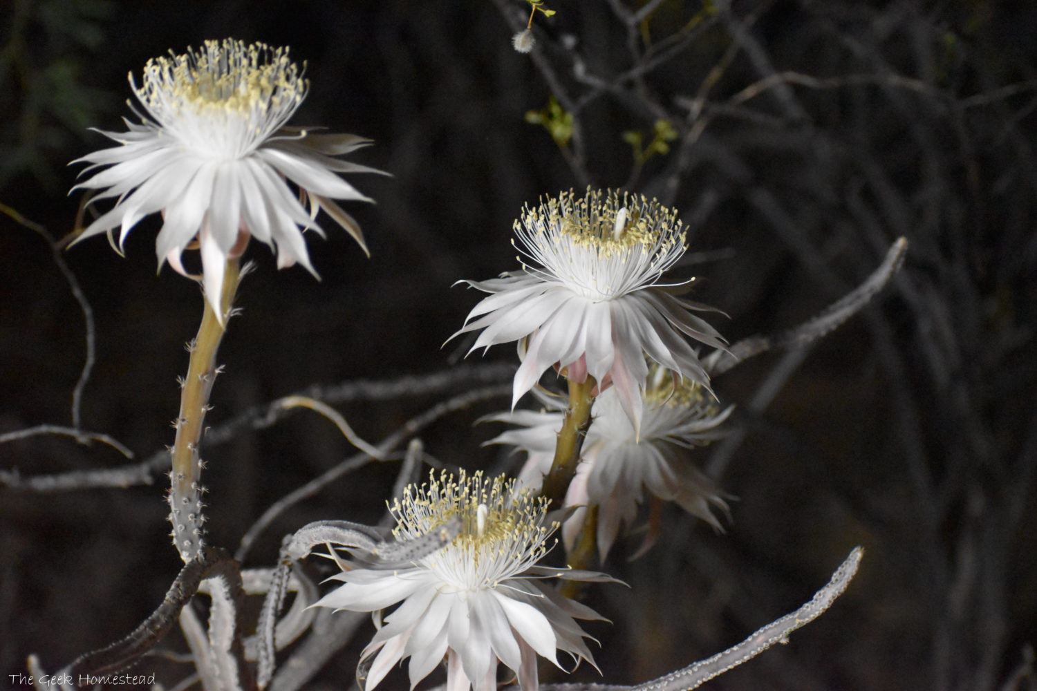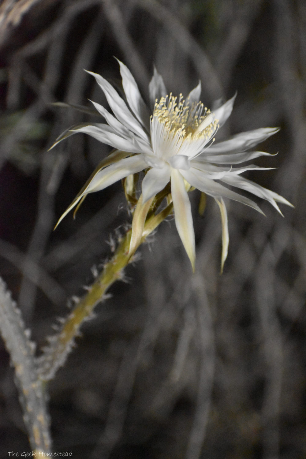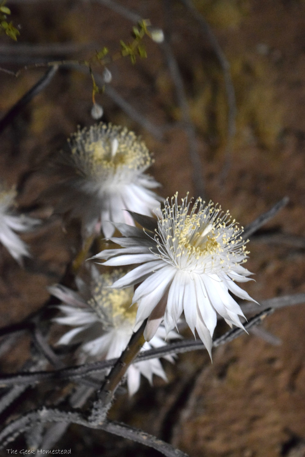 This is the night blooming cereus that is a mesquite tree-hugger. This one’s flowers were the most difficult to take good pictures of. I did my best. I thought it was interesting how this one seems to be a little different from the others: sparser petals and more yellow in color.