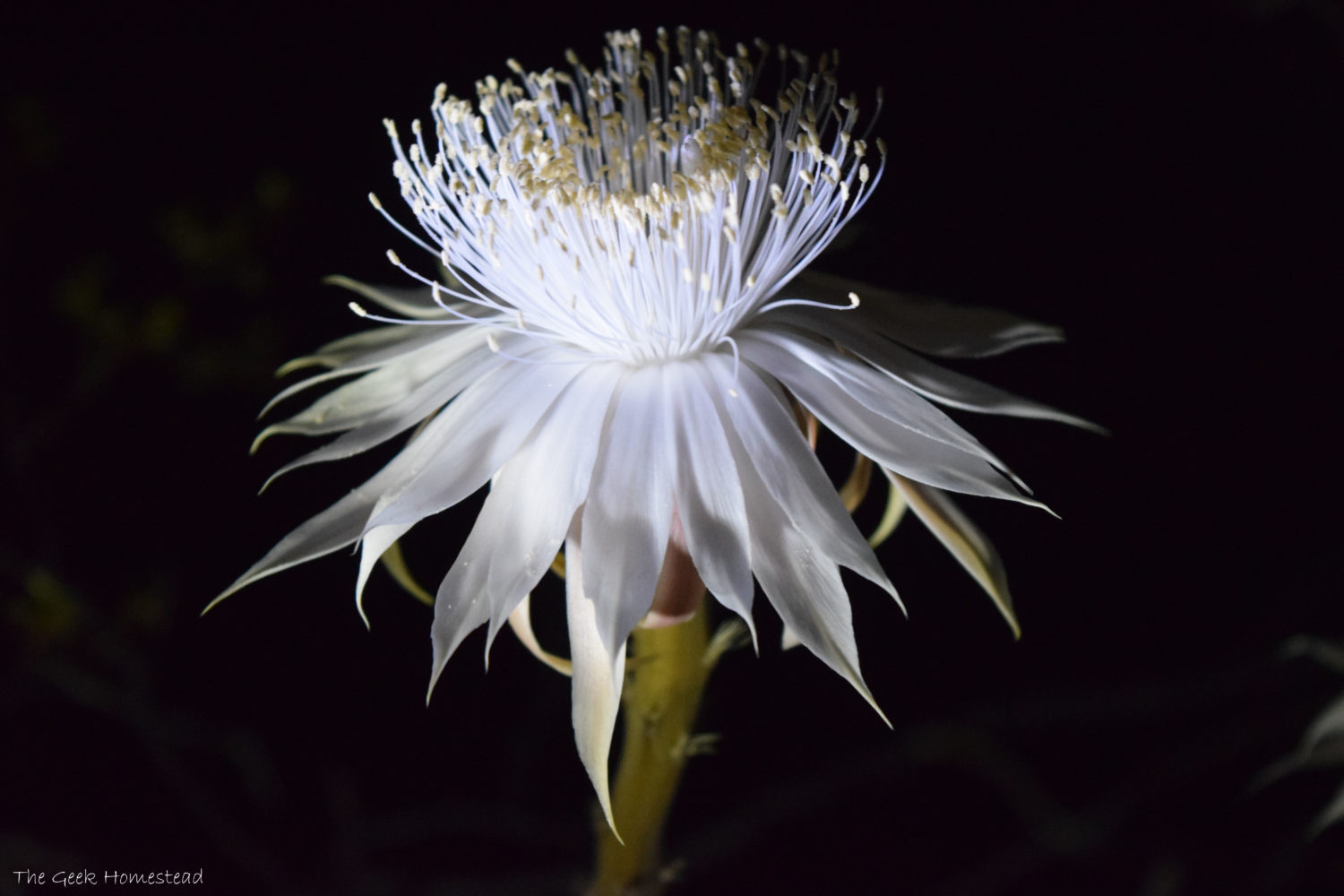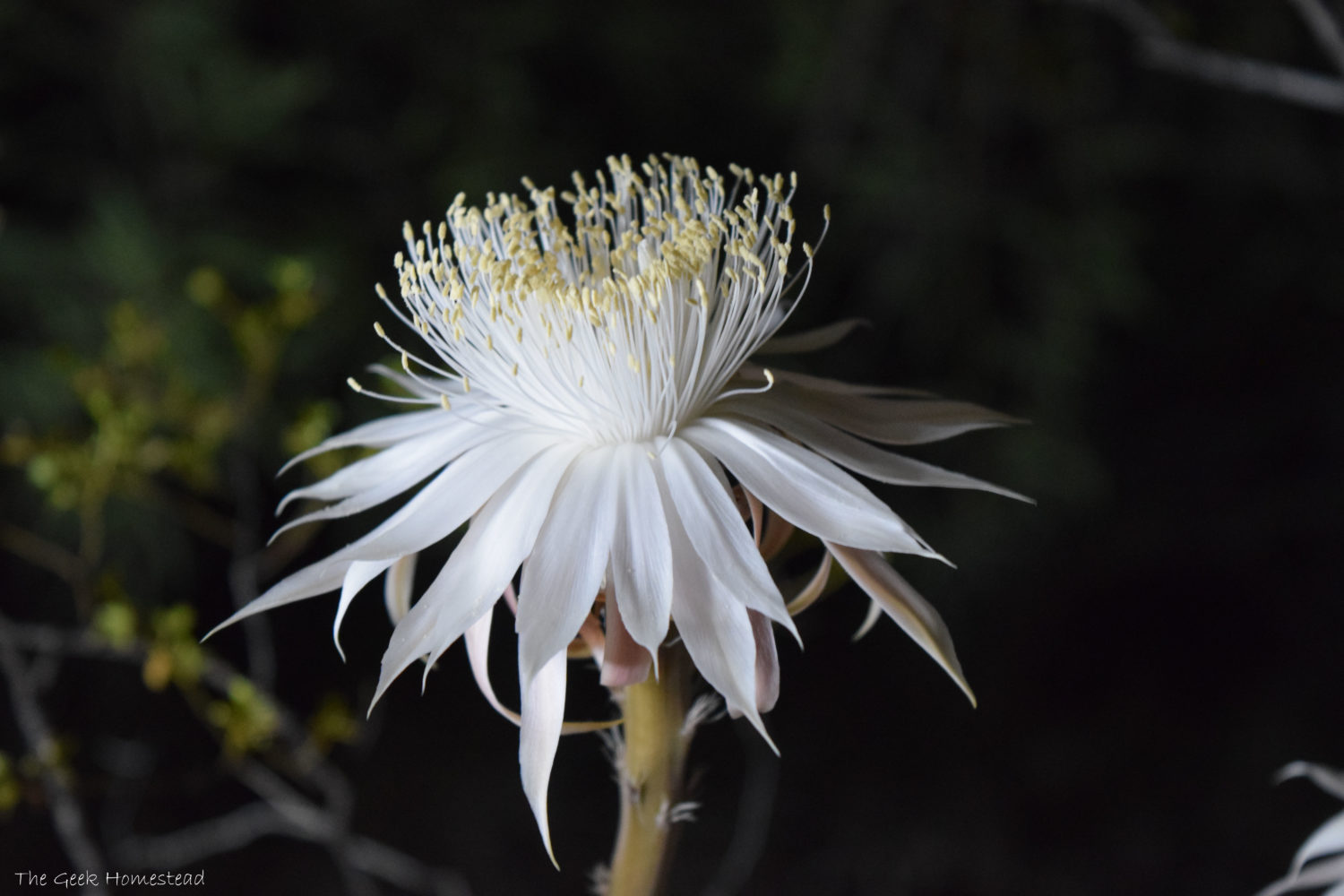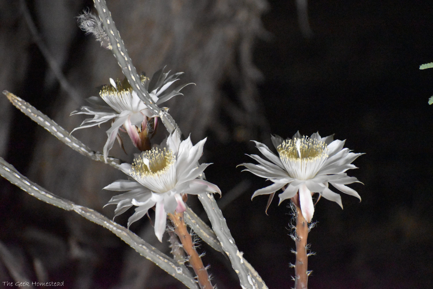 It’s our second bloom night! I talk about our Night blooming Cereus Bloom Watch (which ended up being less than 24 hours) here and our Night-blooming Cereus First Bloom Night here. One of our night blooming cereus bloomed last night, three of the remaining four bloomed tonight, and I think that the stubborn fourth one maybe bloom tomorrow night unless it surprises us and blooms between 9 and midnight tonight.