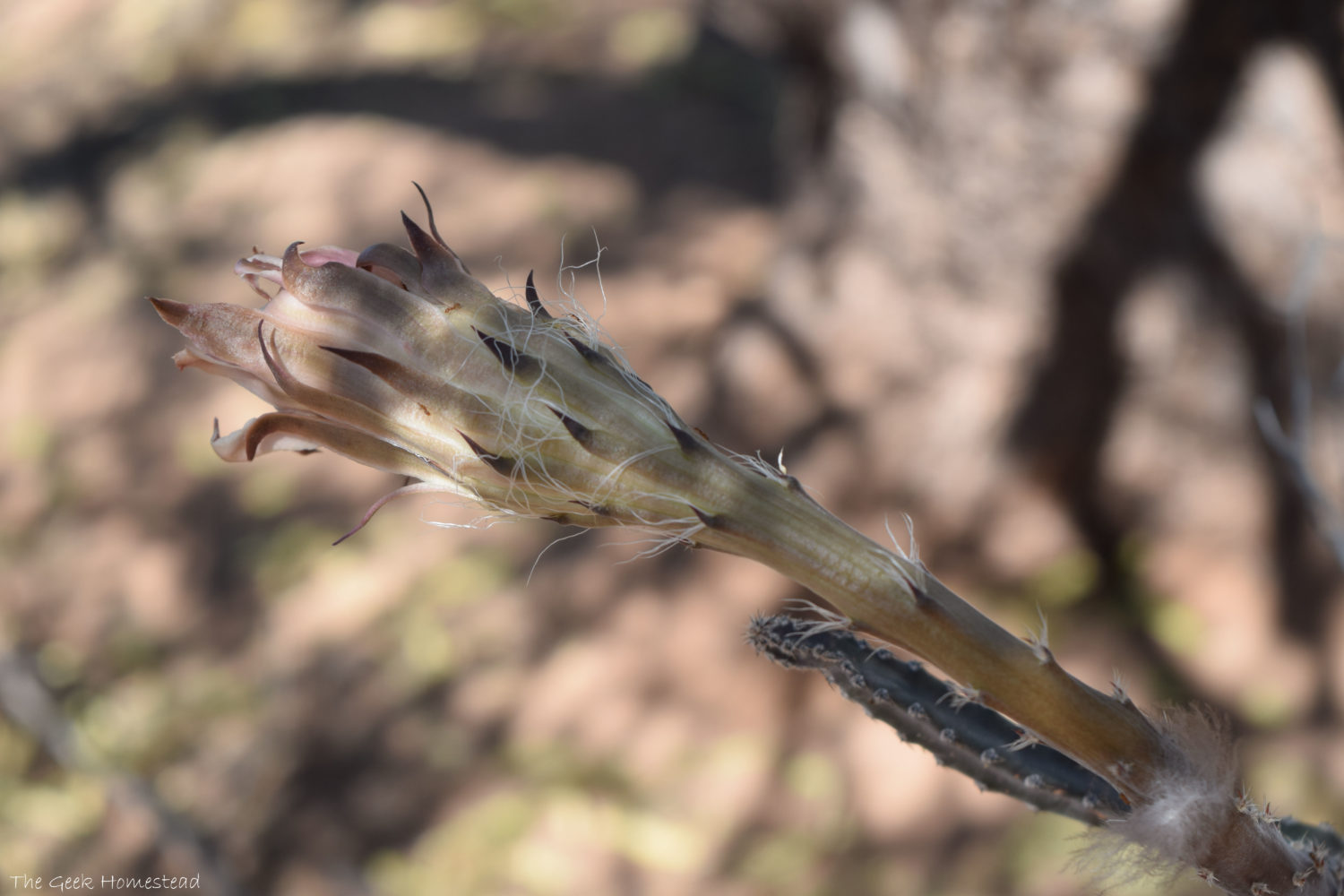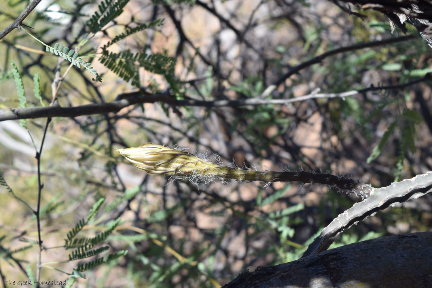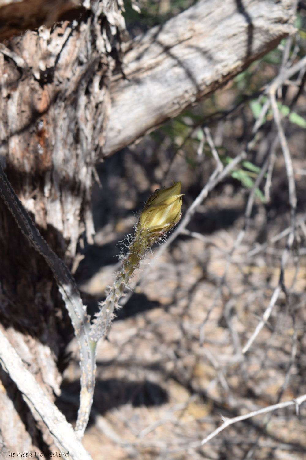 I am going to do something a little different with this post. I’ll put up pictures of each plant grouped as it looked before blooming, while blooming (if I have it), and then when fully bloomed. To continue to the next set of flowers, just click the page numbers at the bottom of the page after the pictures of related posts. I also will post a picture of the desert plants around the night blooming cereus. This cactus certainly does like it’s creepy locales!