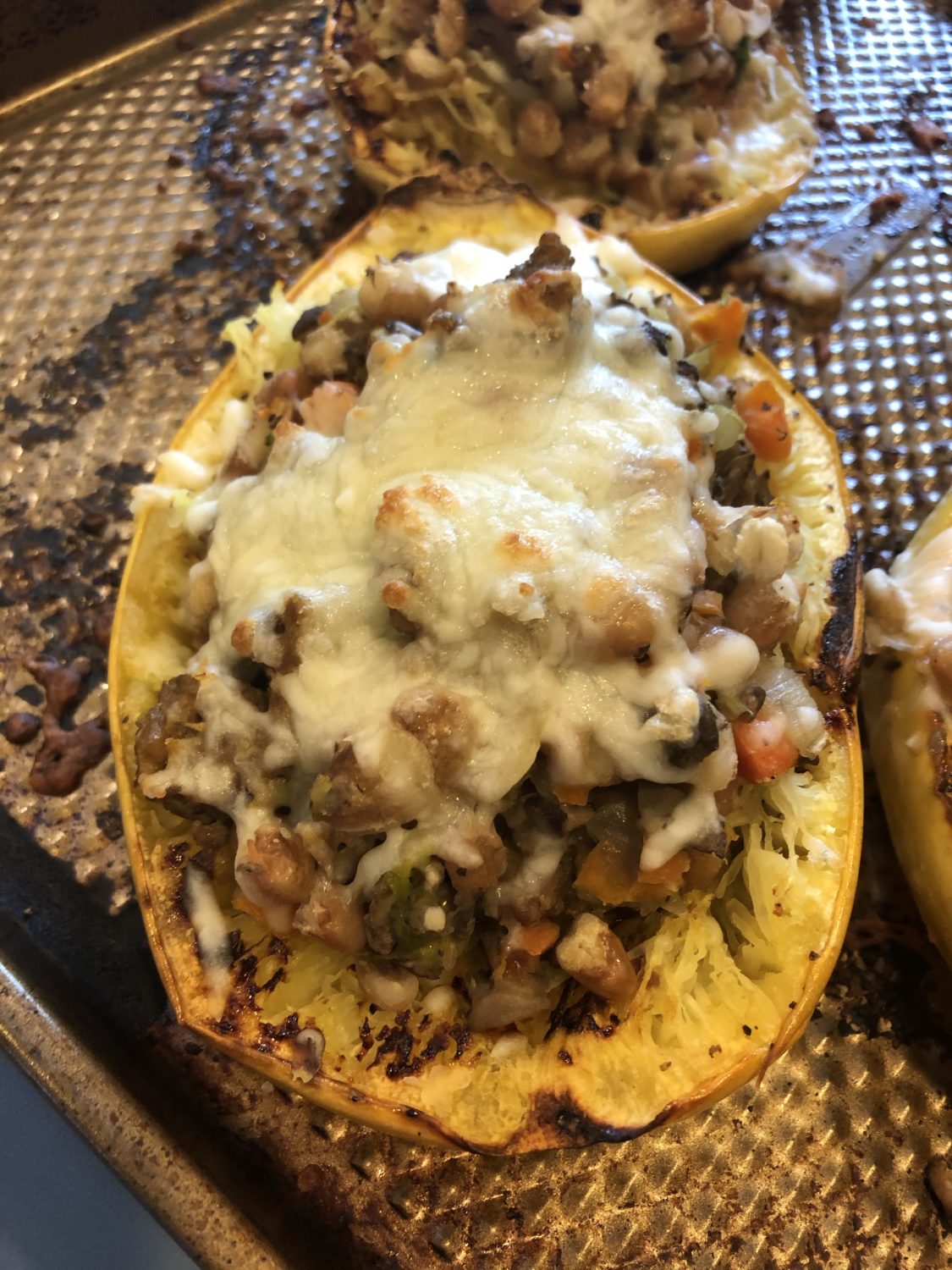 I’ve never been a big fan of spaghetti squash. Maybe because it masquerades as spaghetti when it’s not? I wasn’t going to try making spaghetti out of it like I have before, so instead I opted for stuffing it! It was definitely better that way!
