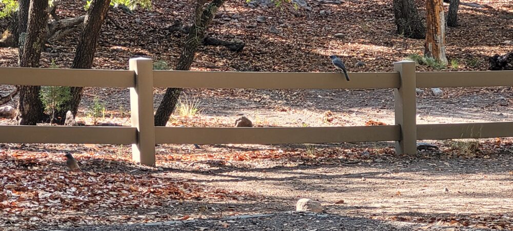 Mexican Jay on the fence, probably waiting to see if we drop food!