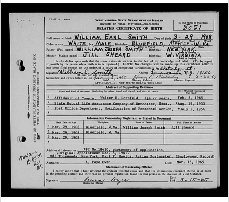 Interestedly, my great-grandfather applies for a delayed certificate of birth 57 years after his birth. His birth certificate gave me a maiden name for his mother, Jill Sheard. Further searches on the West Virginia site showed no birth or death certificate for a Jill Sheard.