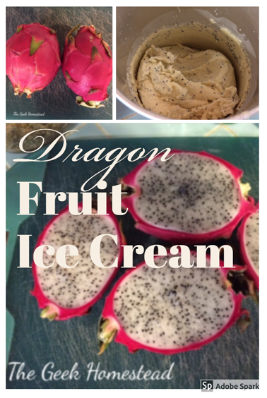 While looking for recipes for dragon fruit, I learned that there are different colors of dragon fruit. There are pink, magenta, and white dragon fruit. The ones we were given were white on the inside. Many of the ice cream pictures I saw online used the magenta-colored fruit. Our white fruit is visually less interesting, but I believe the different colored fruits taste much the same.